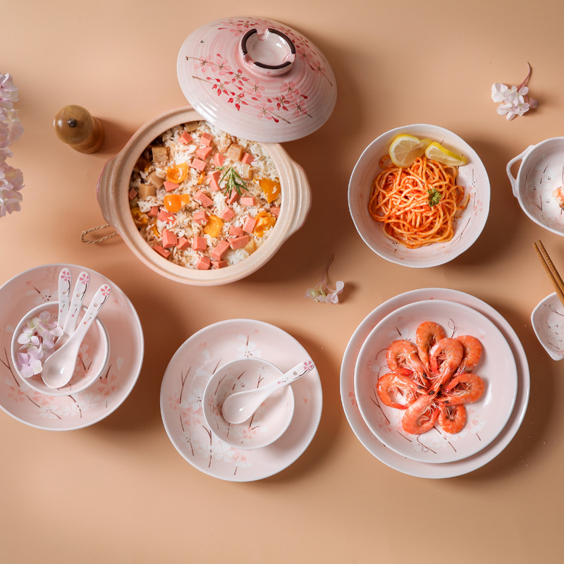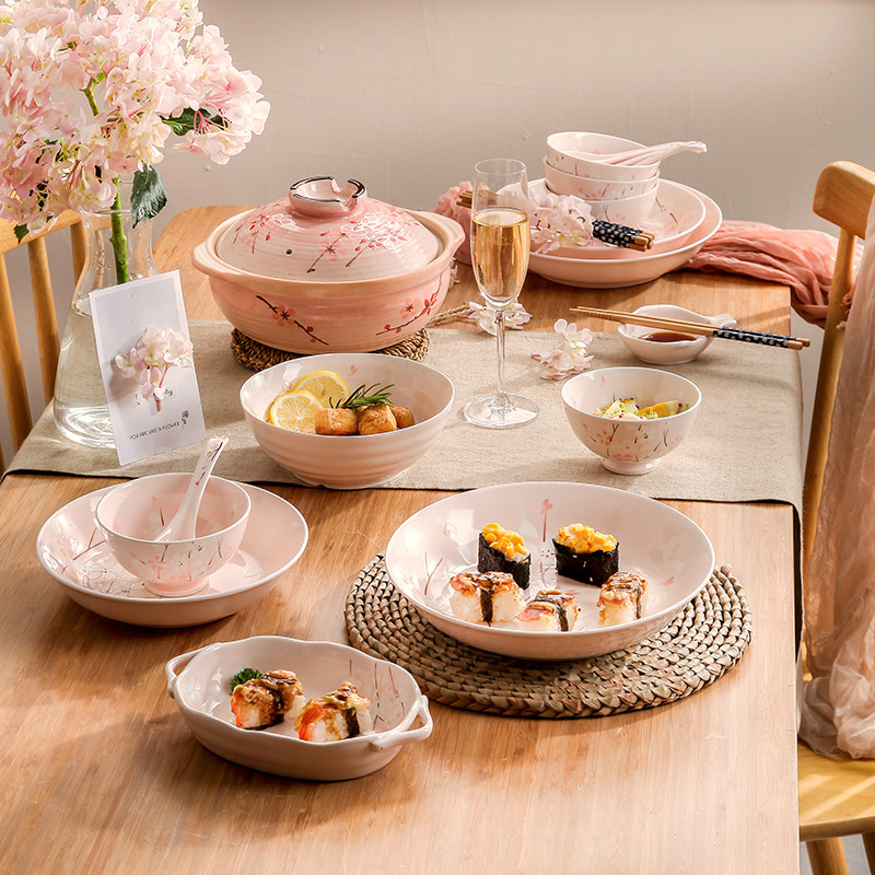 Wantuyaki Japanese tableware set bowl and plate household ceramic rice bowl plate combination hand-painted cherry blossom underglaze color