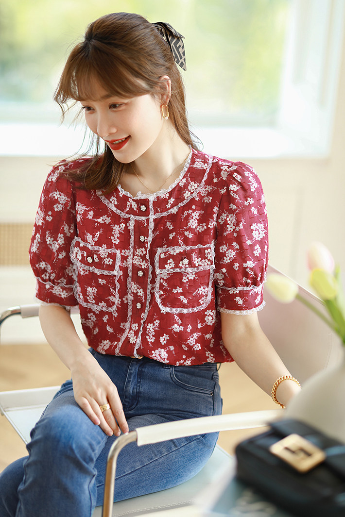En light luxury customization pole-level French style wear Japanese burnt flower craft lace puff sleeve floral shirt female