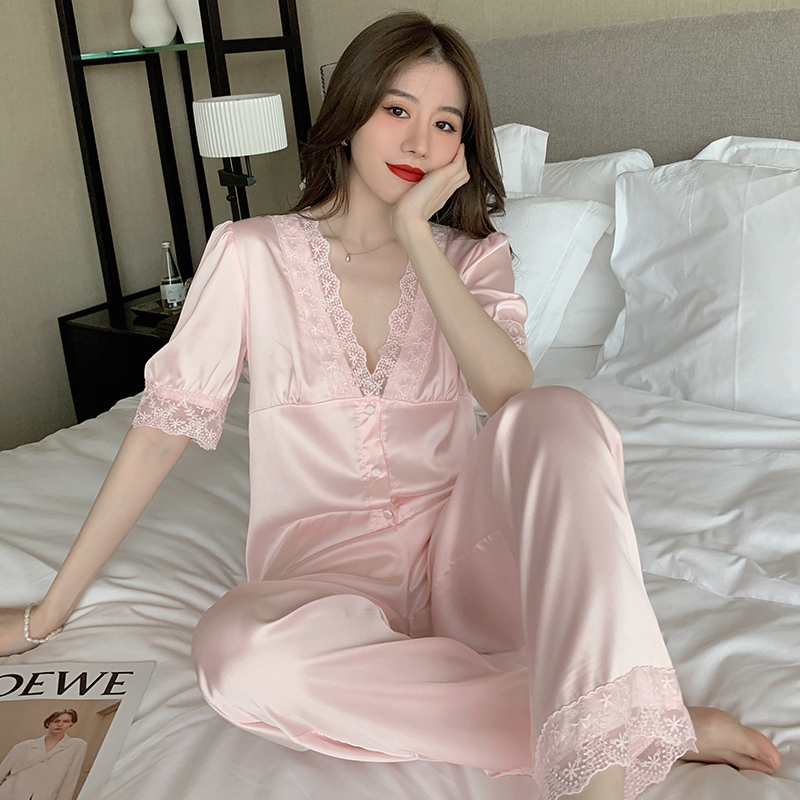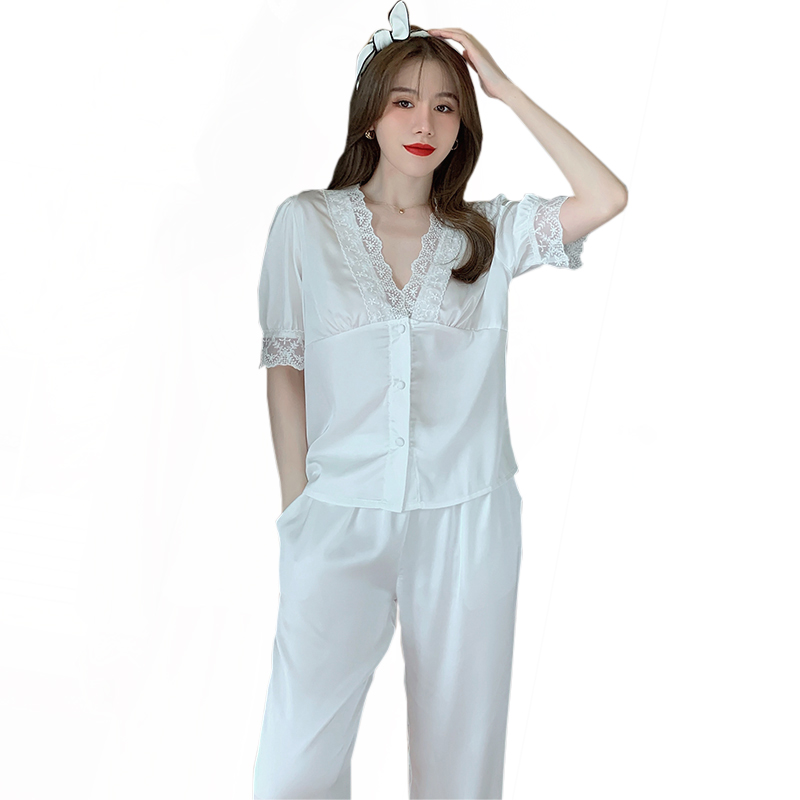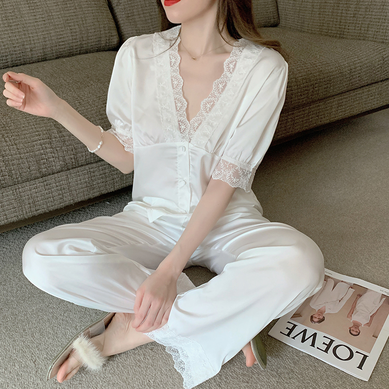 Pajamas women summer ice silk short sleeve pants suit sexy lace white silk high-sense silk red home suit