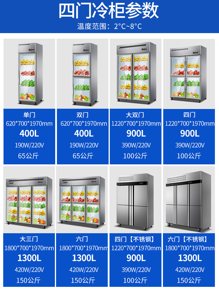 Single door (refrigerated model) Double door (refrigerated model) Big second door (refrigerated model) Four doors (refrigerated model) Big three door (refrigerated model) Six doors glass (refrigerated model) Large second door (frozen model) Four doors glass (cold