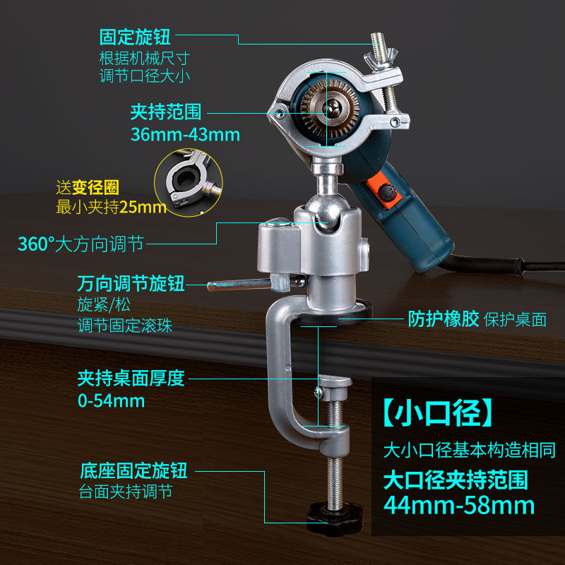 Large-diameter bracket (clamping range 44-58mm) Small-caliber bracket (clamping range 36-43mm) Universal table vise (clamping range 0-57mm) Small-caliber fixed head clamping range 36-43mm] Large-diameter fixed head clamping range 44-58mm]