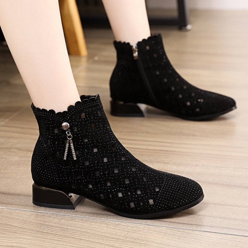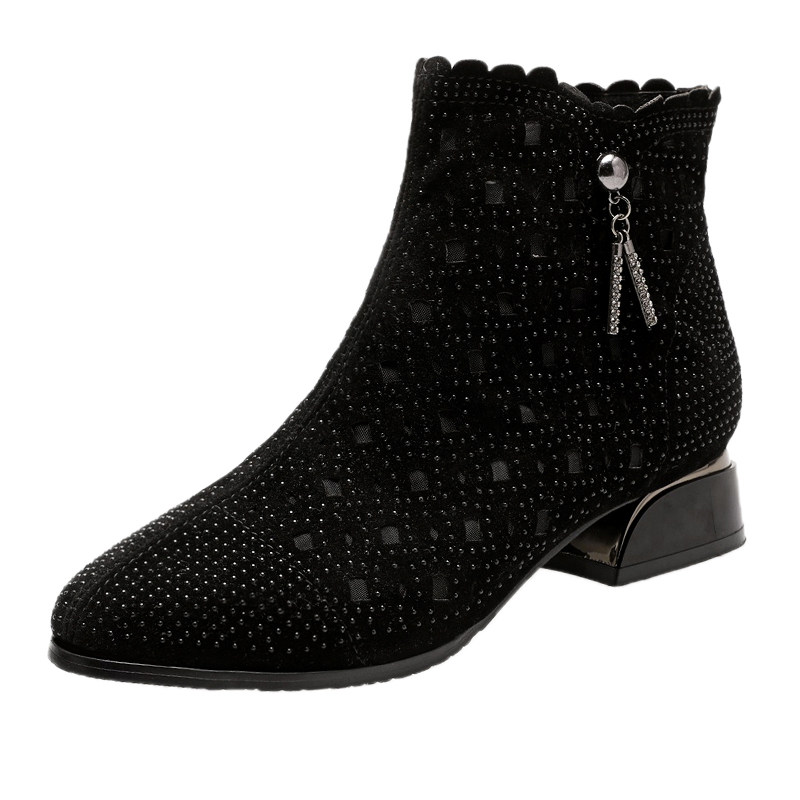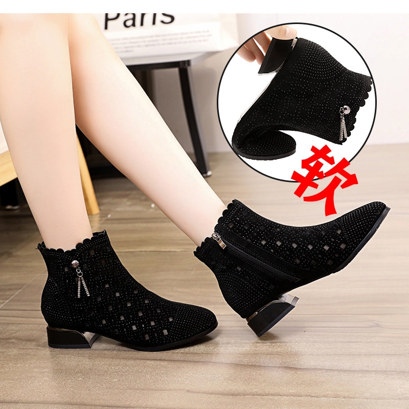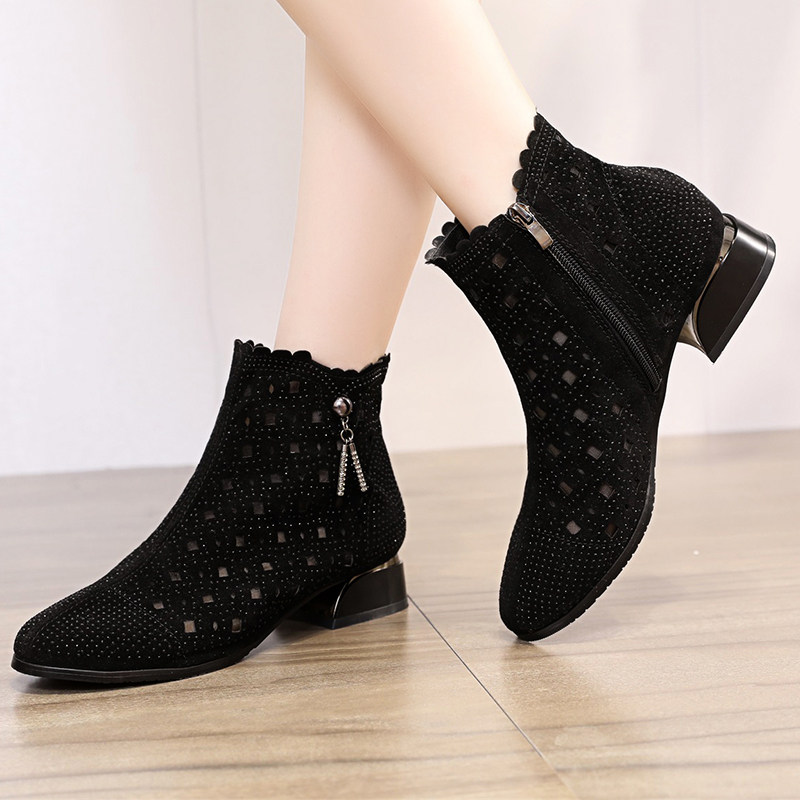 Hollowed-out Mesh Veil Woman Boots 2022 Spring New Coarse Heel Round Head 100 Hitch Genuine Leather Single Boot Fashion Water Drill Soft Leather Sandal