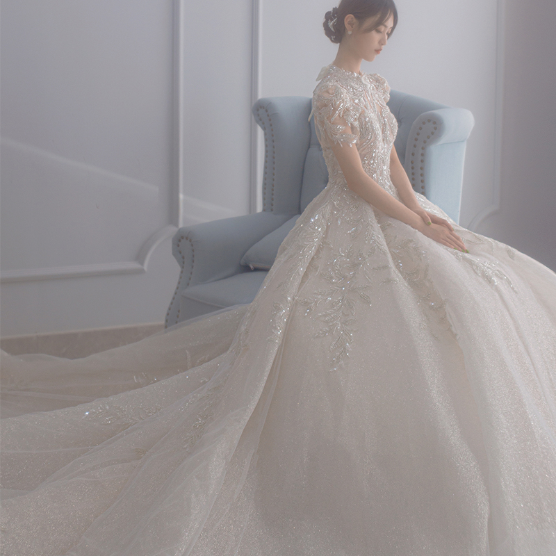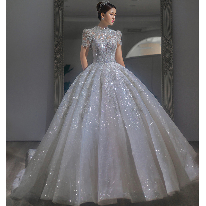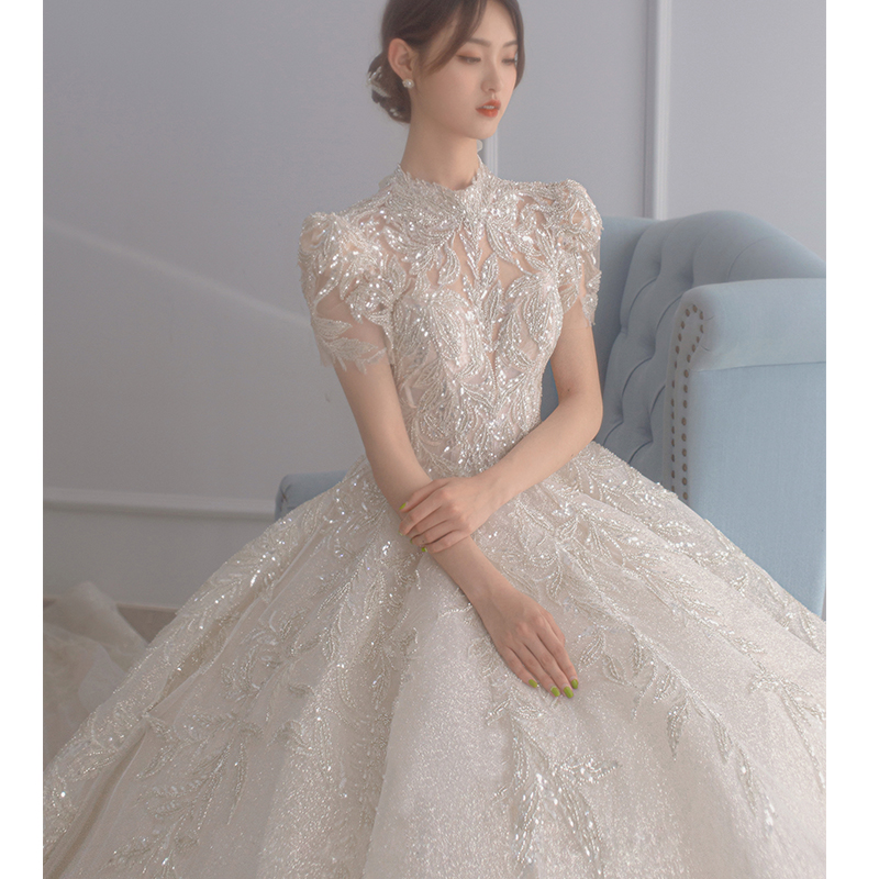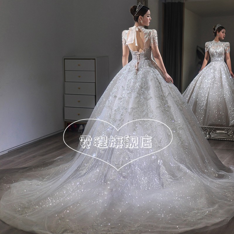 Retro light main wedding dress bride 2022 new big trailing small man standing collar door yarn French female forest series