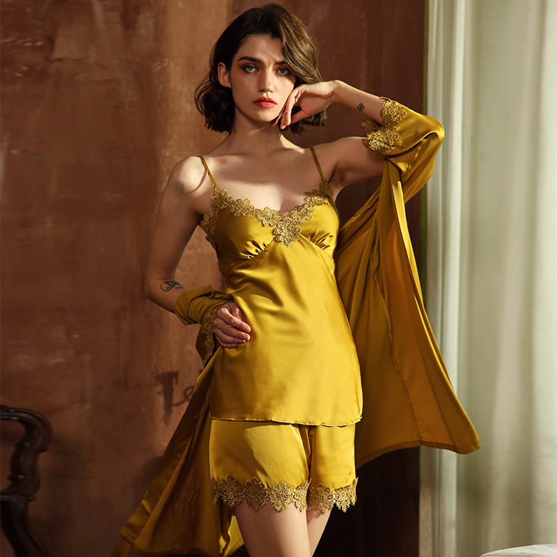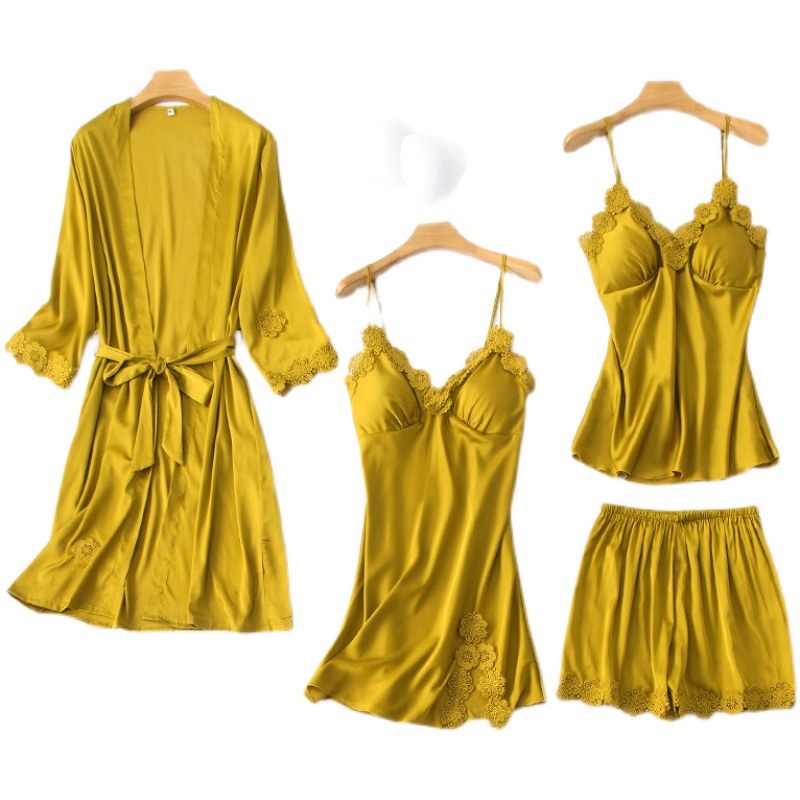 SADO YINER ice silk pajamas women's summer new thin sexy lace solid color suspender nightdress nightgown four-piece set