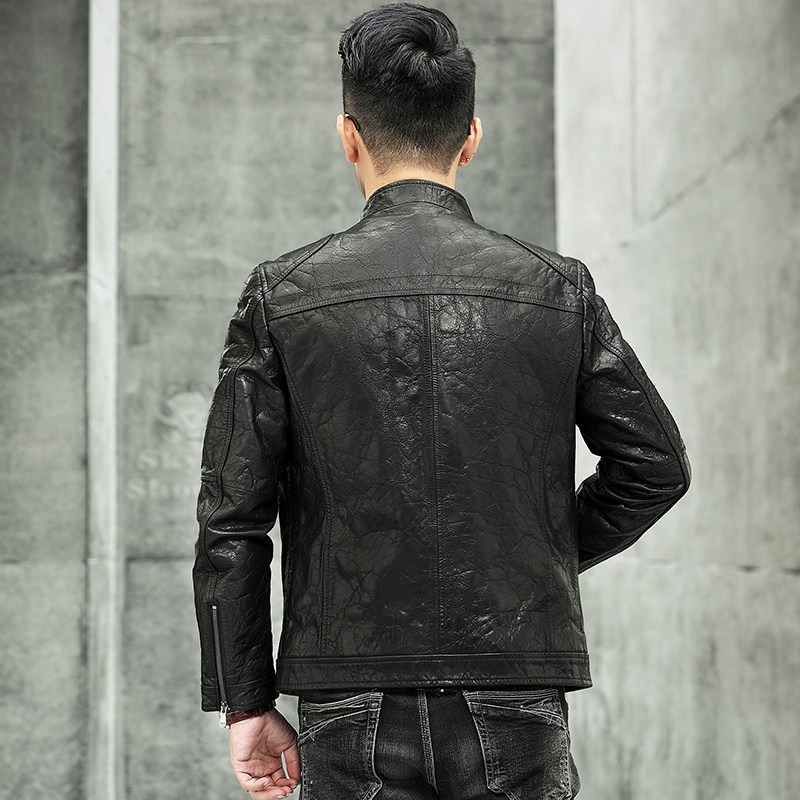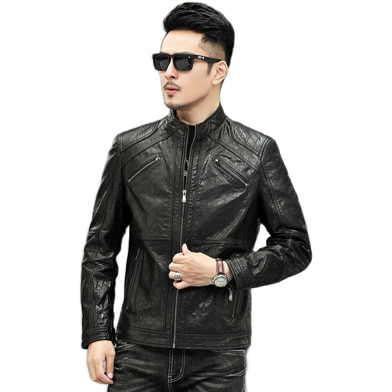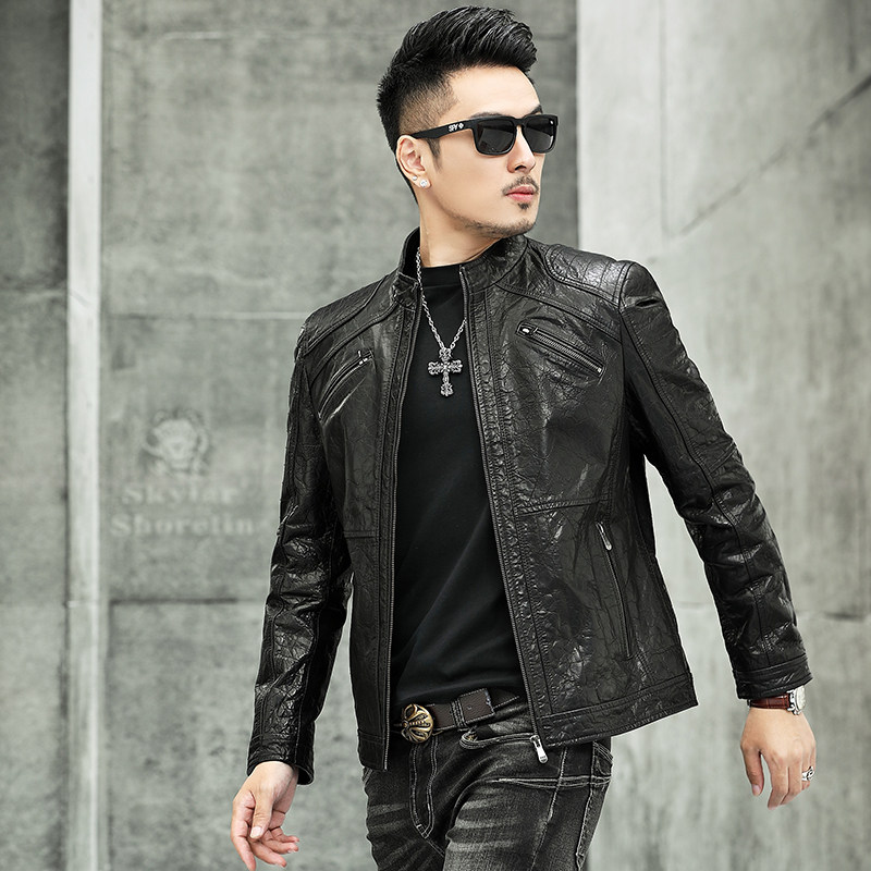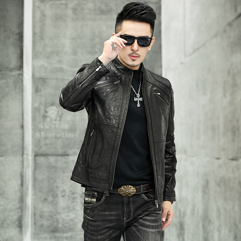 Leather Clothing Men Genuine Leather Calf Leather Retro wrinkled Locomotive Jacket neckline Vertical Collar Casual Youth Short men's clothing