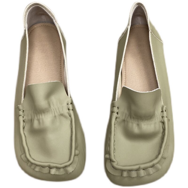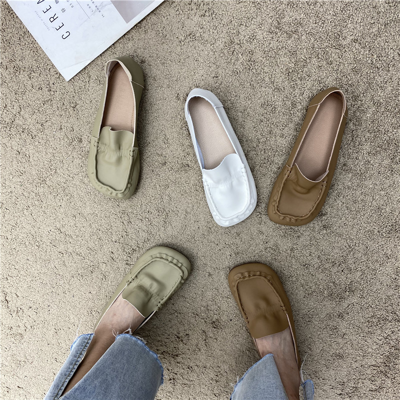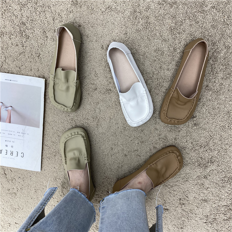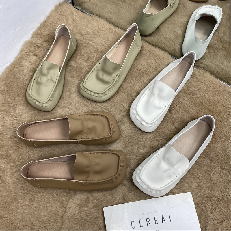2022 Fall new Korean retro art square head casual grandma shoes soft leather pleated soft bottom driving bean-bean shoes