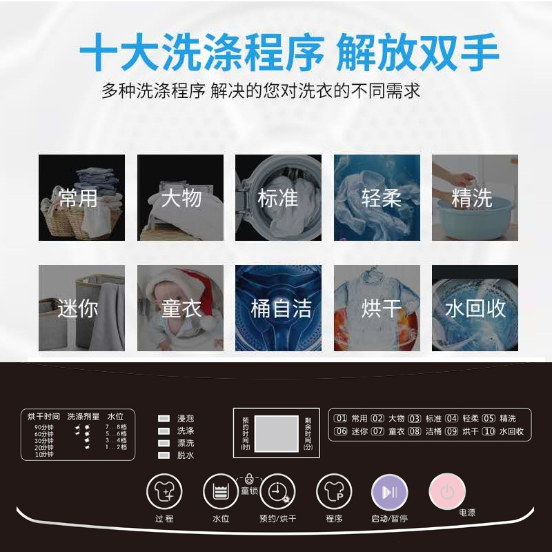 Wave wheel type powerful fast single wash gentle dehydration large objects standard wash single dehydration barrel air drying single dehydration underwear left water air dry quick wash, commonly used, standard, denim commonly used strong quick wash no iron wool home textile standard down underwear quick wash rinse rinse soak wash Standard, Fast, Soak Wash, Single Wash, Single De-dry, Barrel Air Drying Single Dehydration, Smart Wash, Energy Saving, Barrel Clean, Single Drying Healthy Wash, Clothing Volume Perception, Wrinkle Prevention, Stain Removal, Custom Program, Water Recovery, Mini Wash, Children's Wash, Barrel Air Drying, No Cleaning Gentle Drainage, Gentle Wash, Standard Wash, Soak Wash