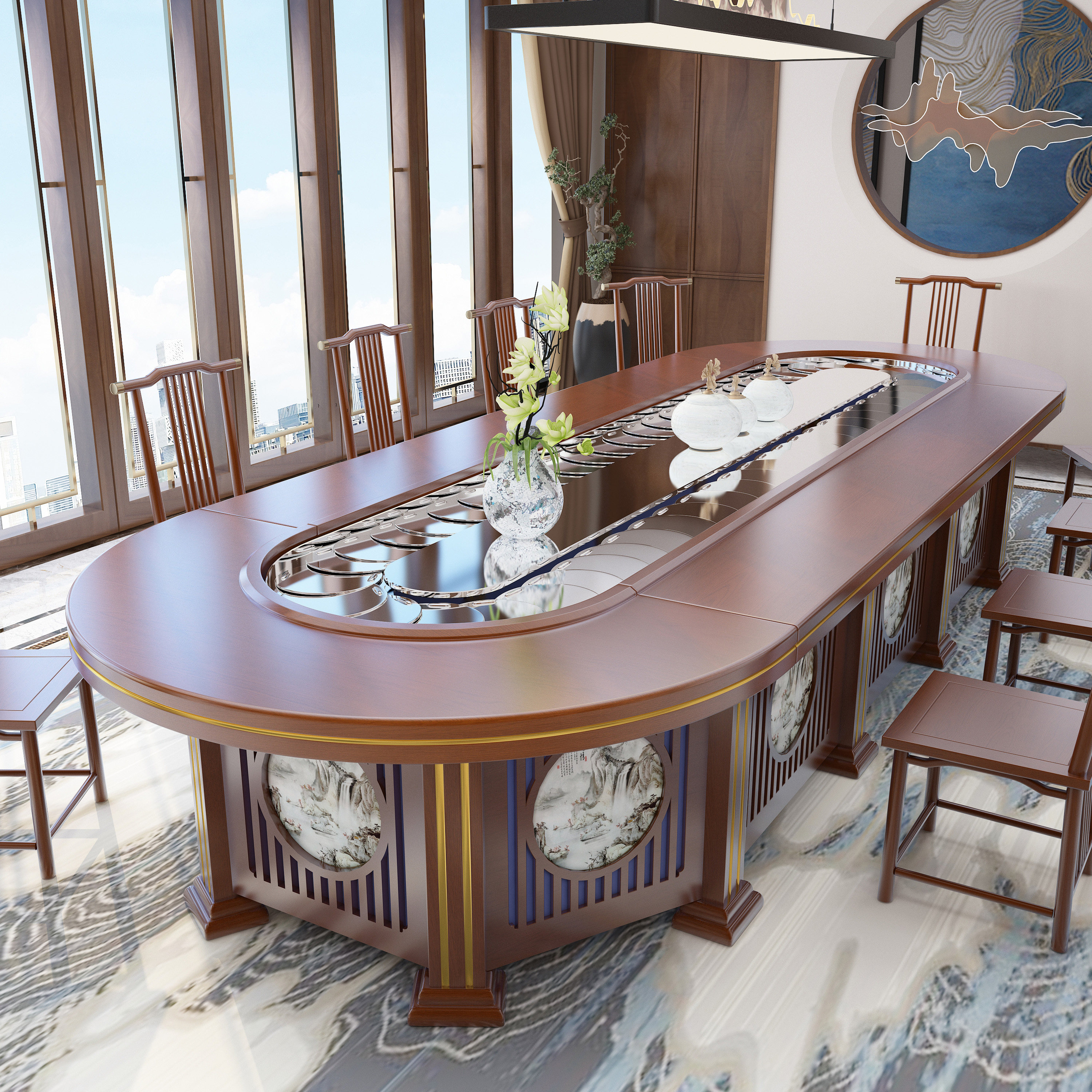 New Chinese Dining Hall Elliptical Electric Dining Table Rectangular Solid Wood Dining Table Conveyor Belt Hotel box 20 People banquet table