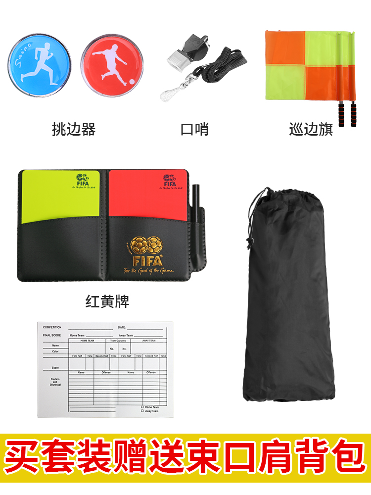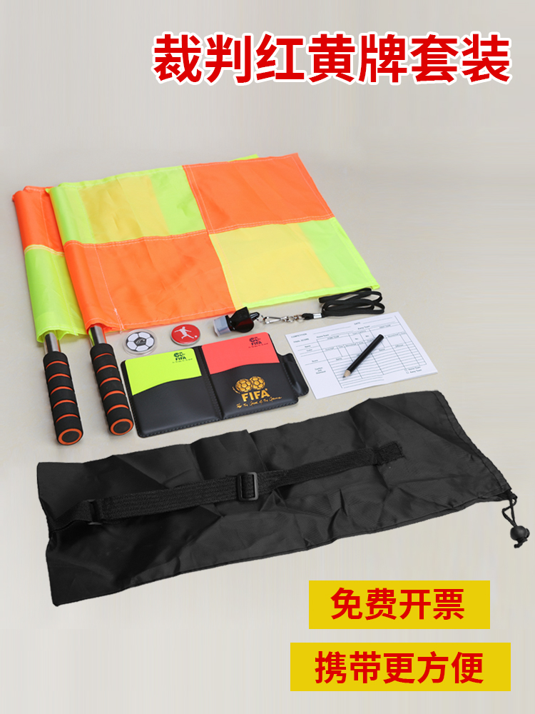 A set of red and yellow cards, a sauo edge picker, a saurus picker, a whistle, a whistle (random color) 2 border patrol flags, a red and yellow cards, a whistle, a saurus, a saurus, a saurus, a saurus, a saurus, a saurus, a saurus, a saurus, a saurus, a saurus, a saurus