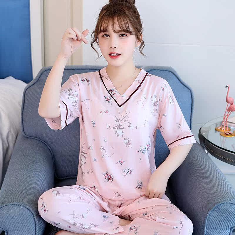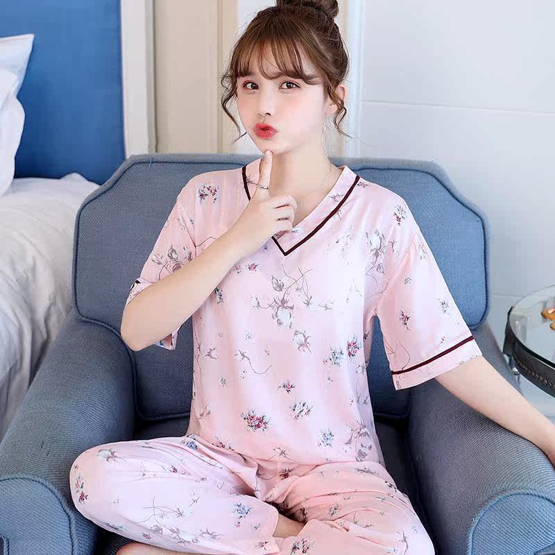 Spring and autumn cute cotton silk pajamas ladies summer pullovers can be worn outside suits short-sleeved trousers cotton silk thin home clothes