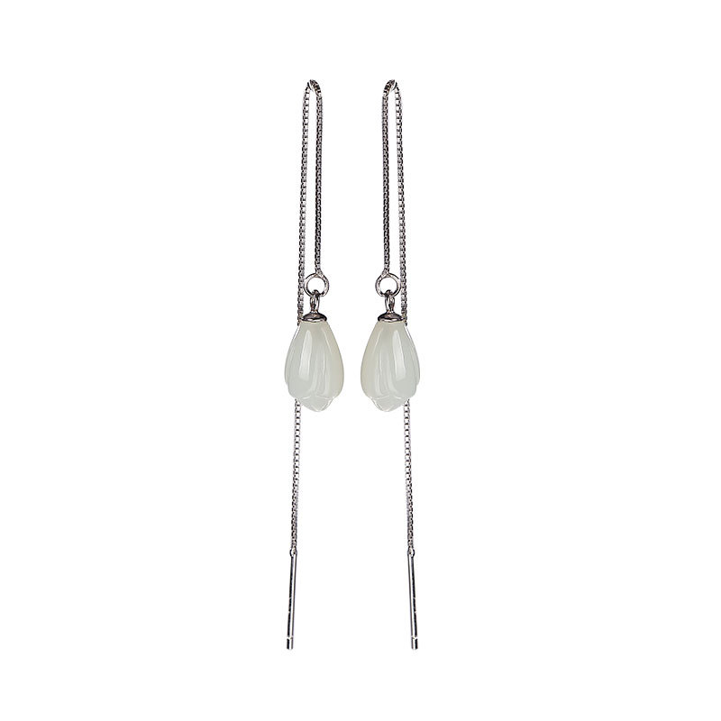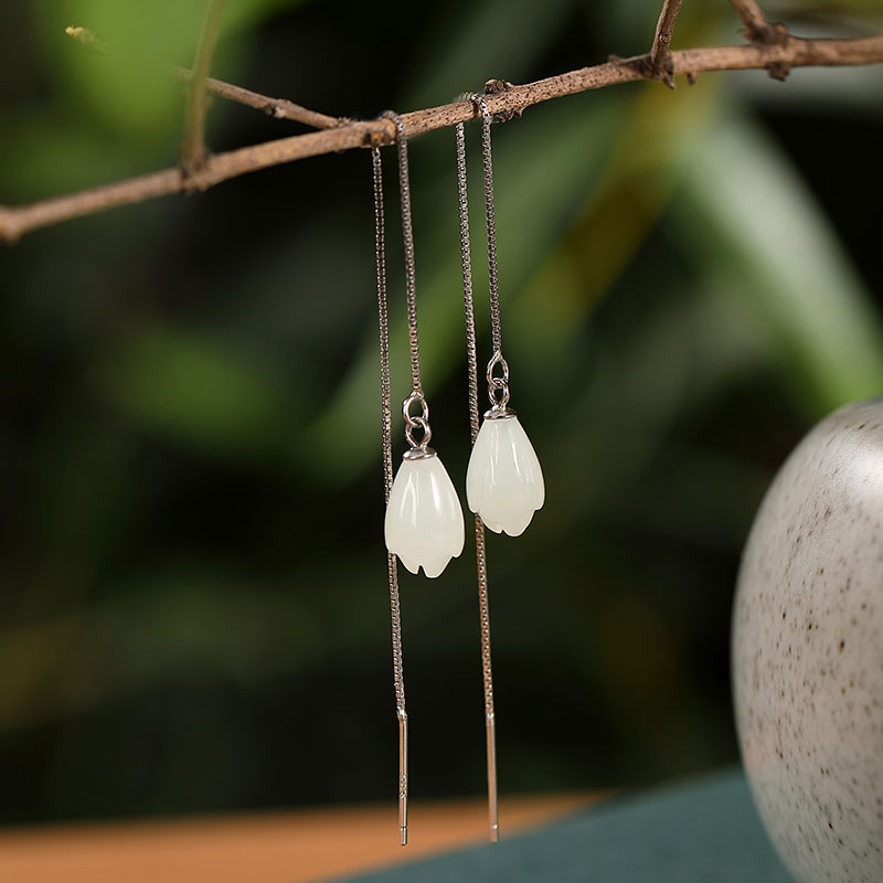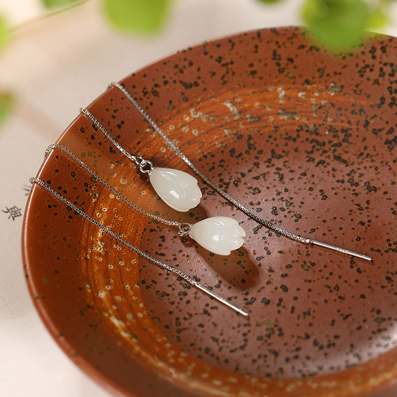 S925 sterling silver natural Hetian jade earrings simple high-end all-match long magnolia flower jade earrings earrings