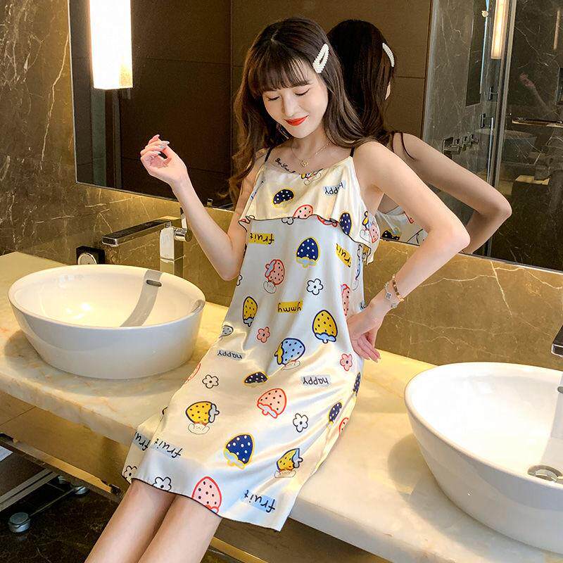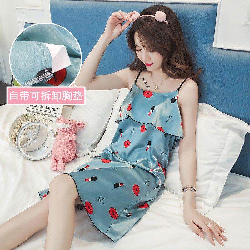 Pajamas women's summer Korean version is very fairy student ice silk suspenders nightdress thin section sexy silk belt chest pad home clothes