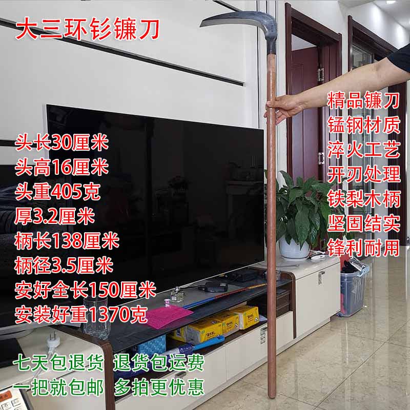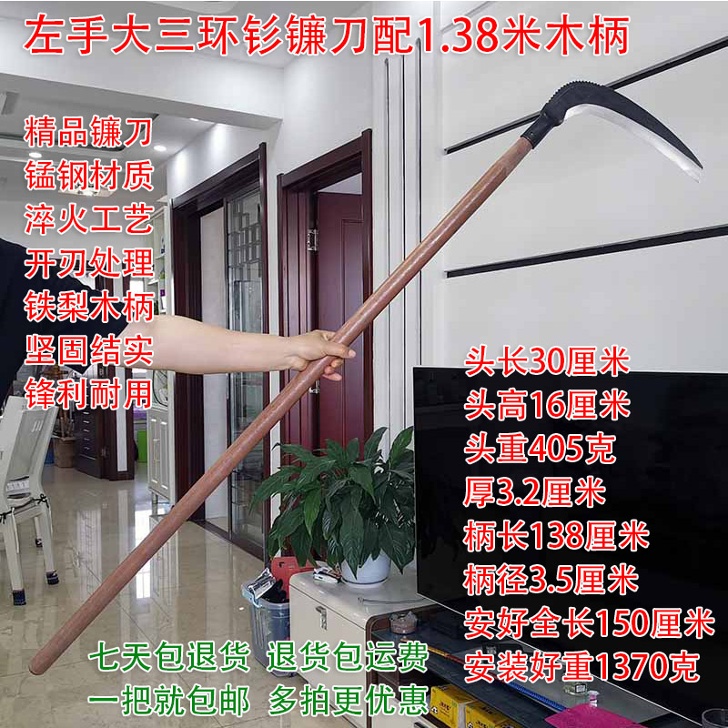 The large three-ring samarium knife farmer uses the lawn mowing sickle left and right hand thickened manganese steel sickle to lengthen the wooden handle to weed to remove weeds