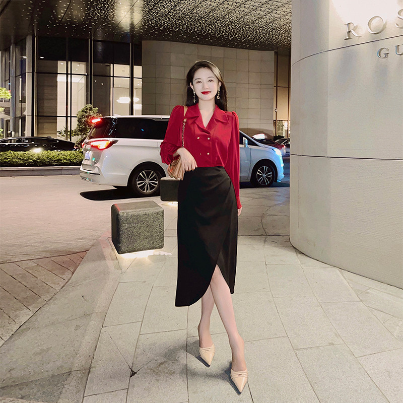 Lin Guanguan black skirt high waist a-line skirt mid-length small design sense high waist thin skirt women's summer