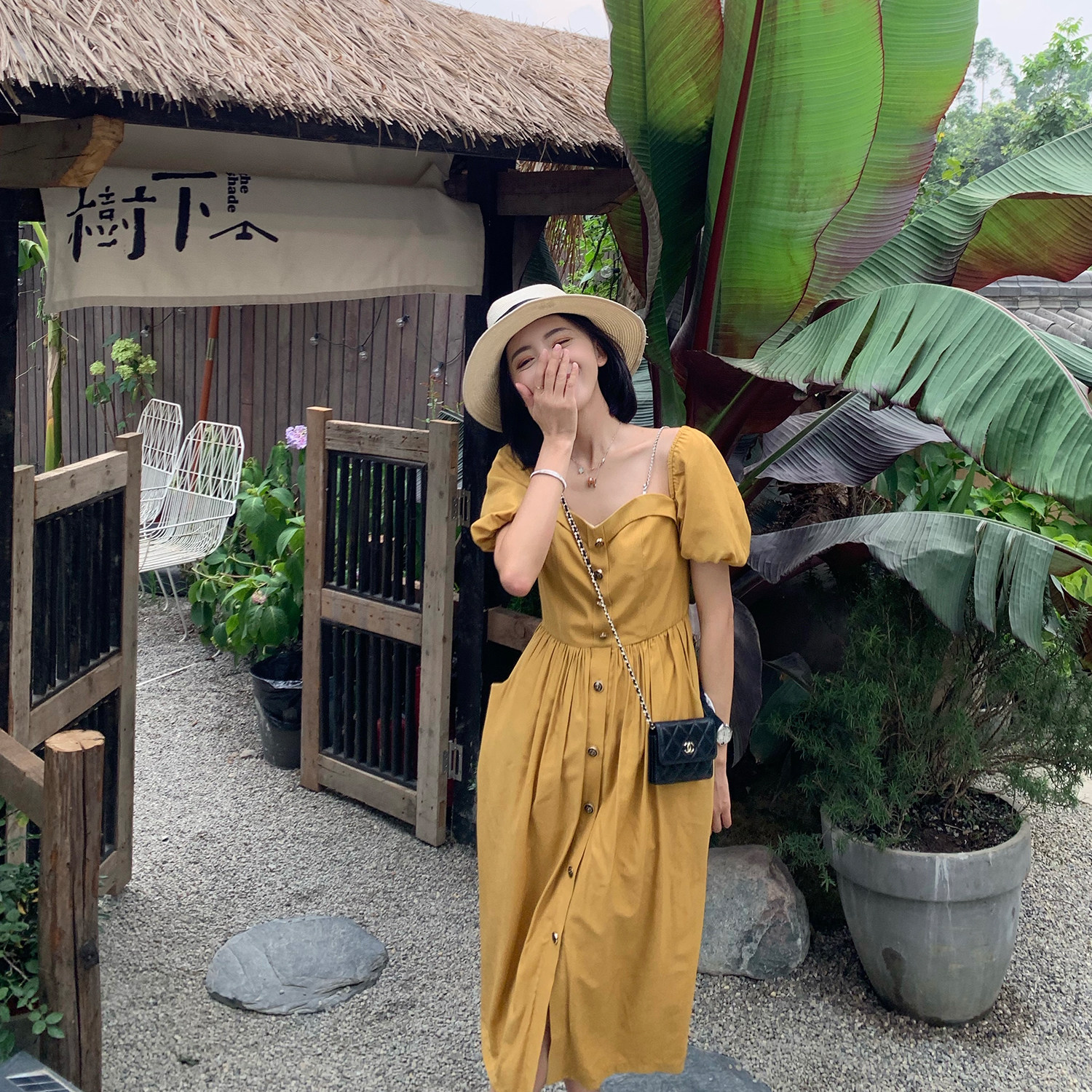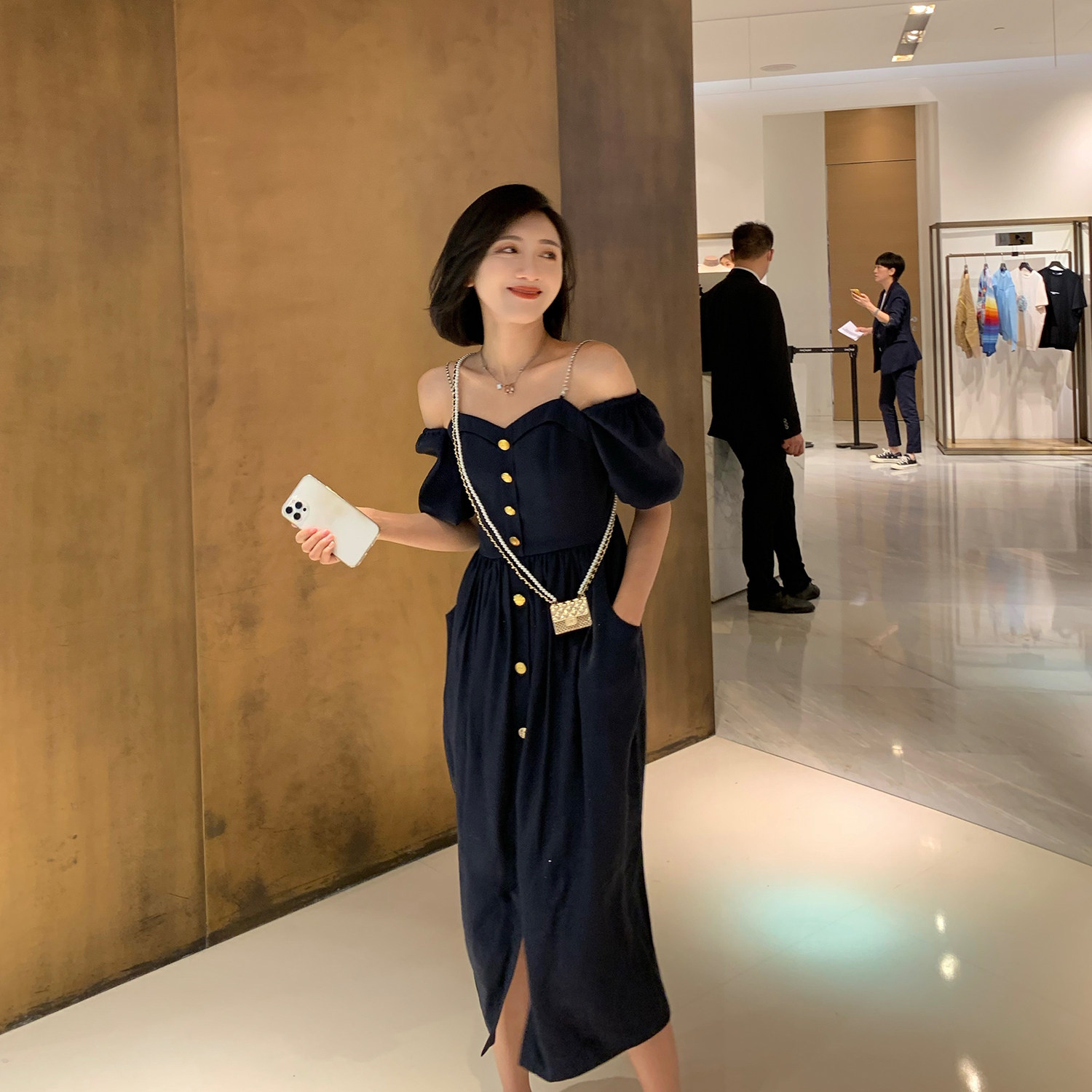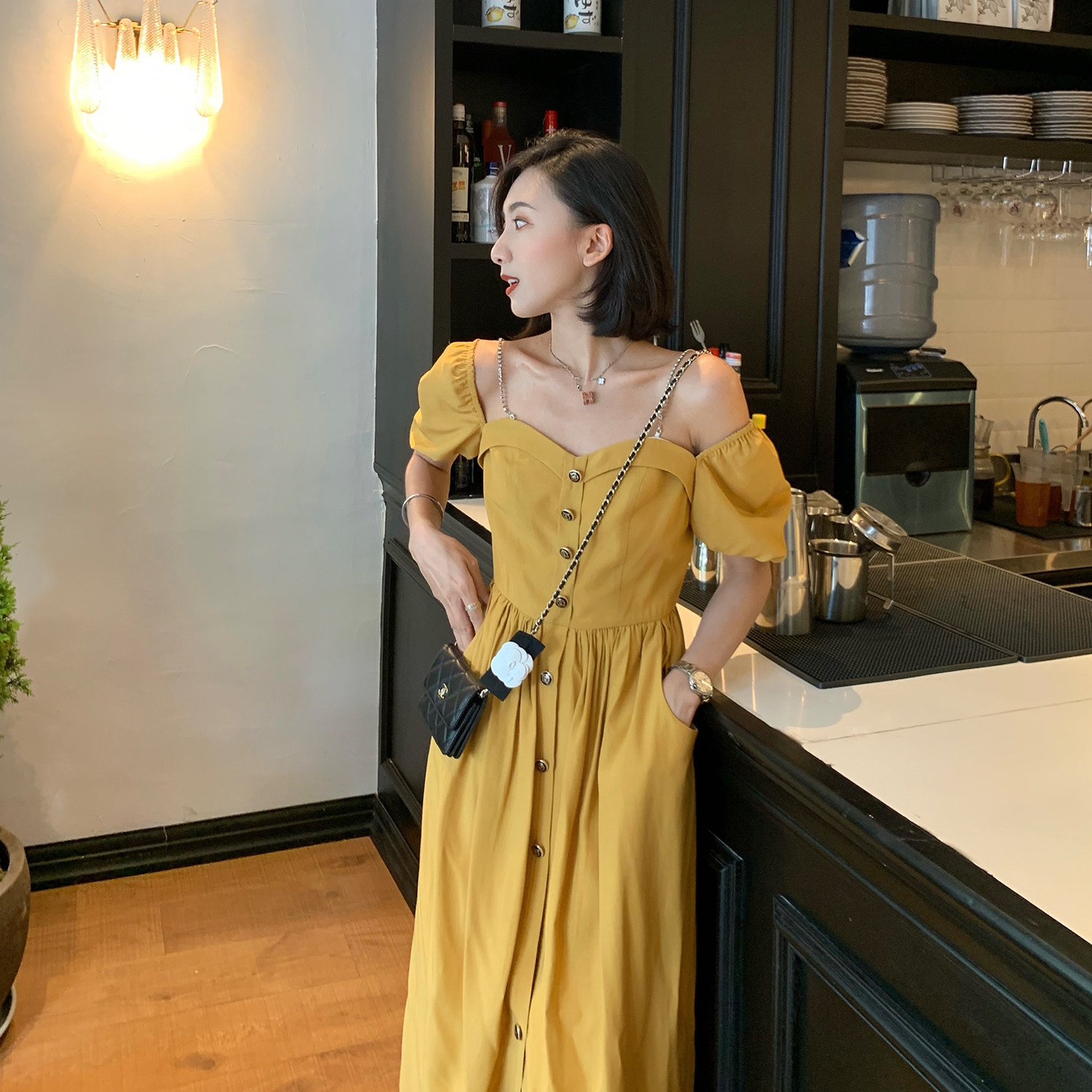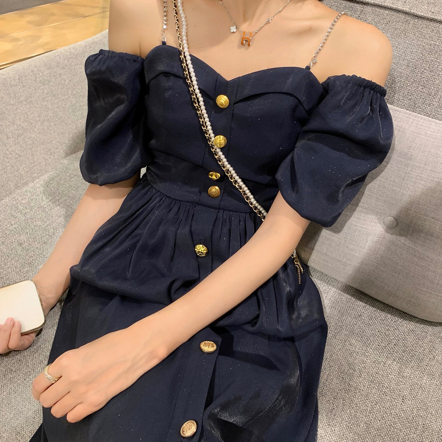 tina mid-length version of the word neck suspenders puff sleeves two-wear skirt women's summer temperament vintage dress