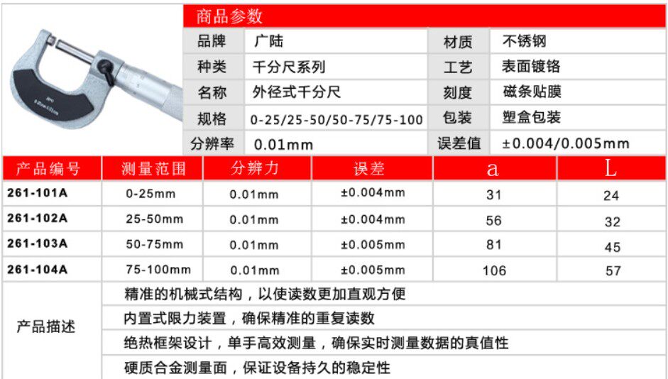 Guilin Guanglu Outer Diameter Micrometer 0-25-50-75-100 * 0 01mm Mechanical high-precision micrometer