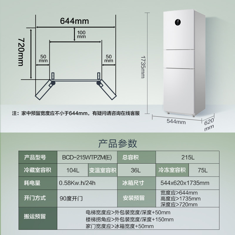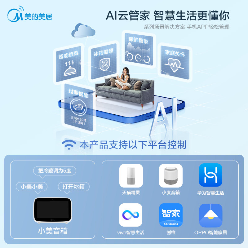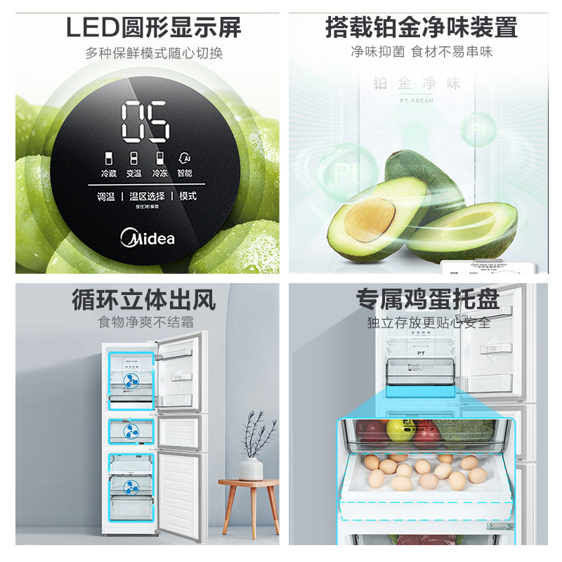 Midea's 215-liter white three-door refrigerator small home dormitory energy saving intelligent first-class air-cooled frost-free