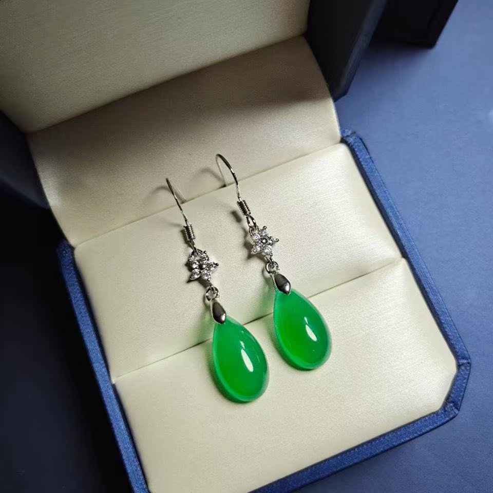 Natural agate green jade medullary drop earrings S925 pure silver ear hook ear pendant retro Han suit qipao-TV-Taobao