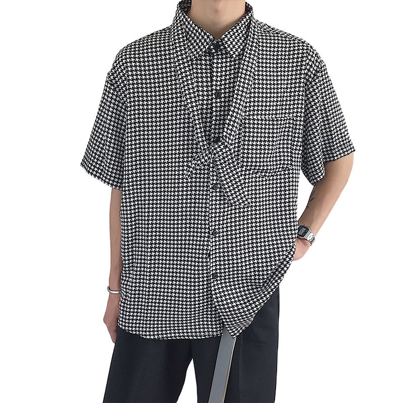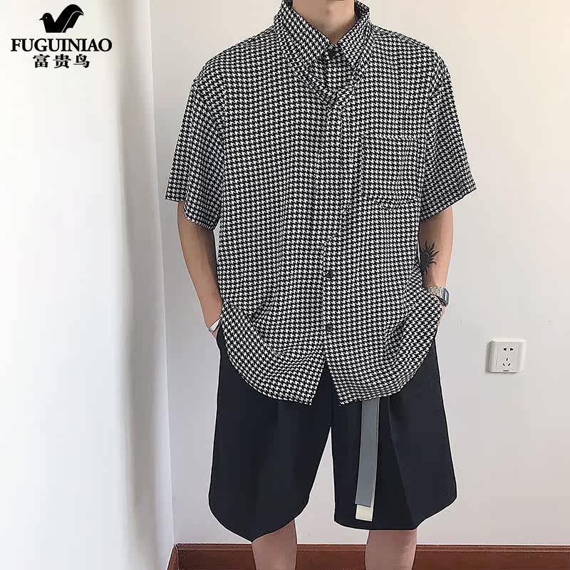 Rich Gui Bird Shirt Male Tide Short Sleeve Design Sensation Small Crowd of Thousand Birds Plaid Outside Wearing Loose Ice Silk Day Series Pendant Sensation