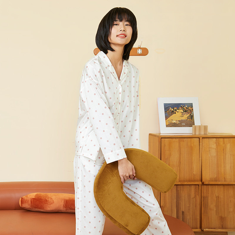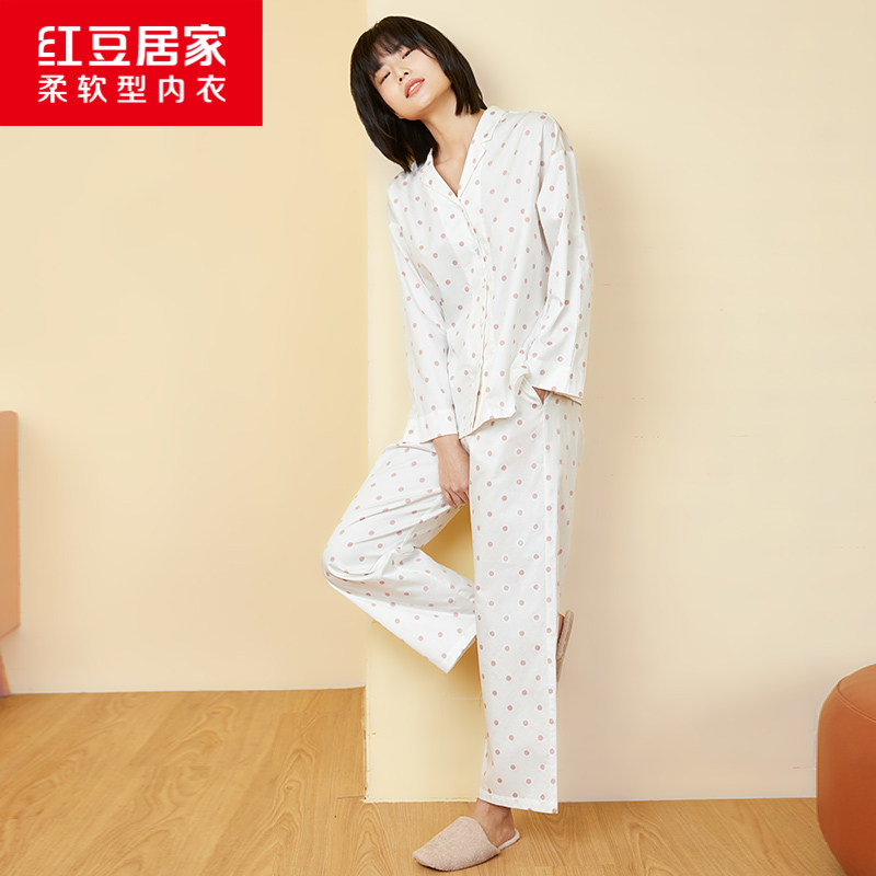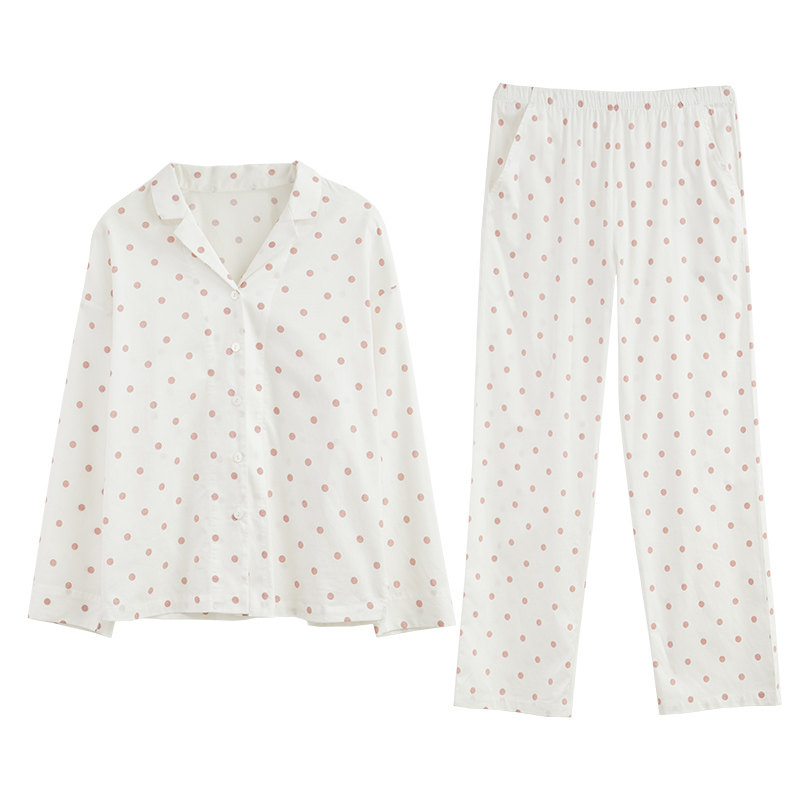 Pure Cotton Pyjamas Lady Long Sleeve Wave Dot Printed Suit Red Bean Total Cotton Large Size Casual Home Dress Lady Spring Summer Thin