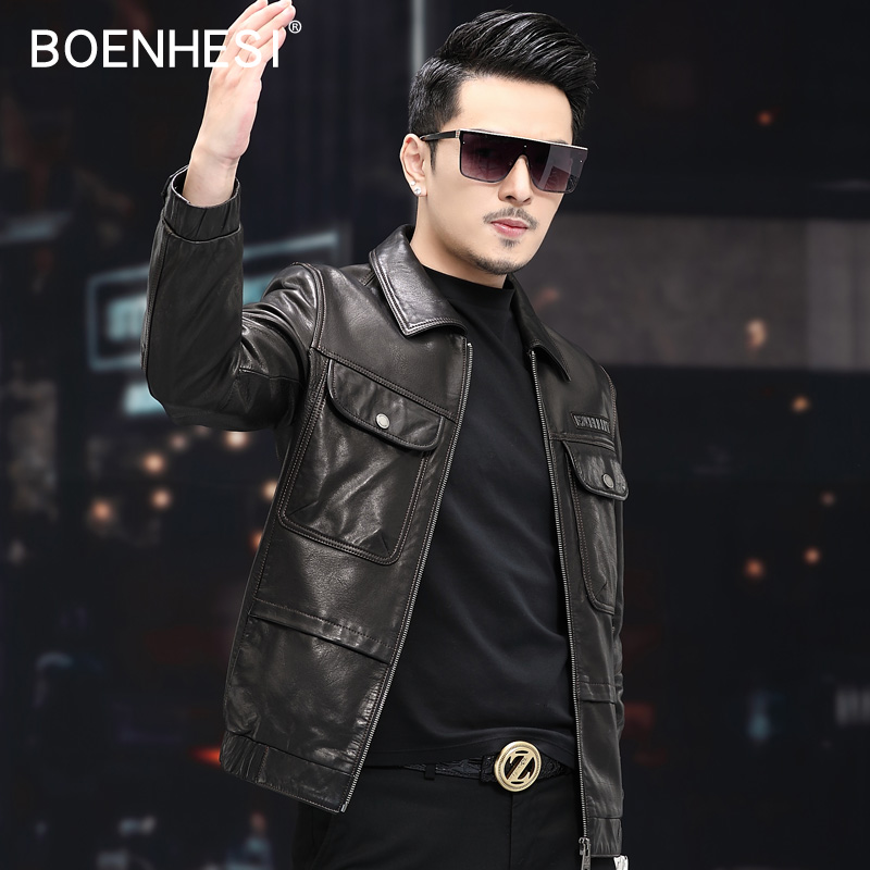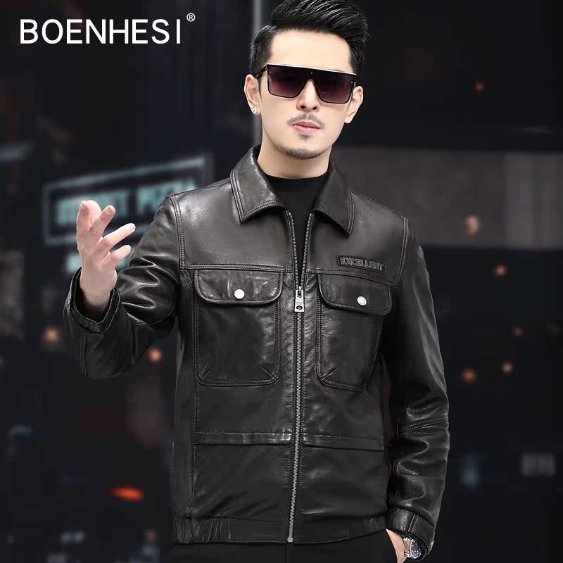 New Haining men's genuine leather jacket short leather jacket lapel motorcycle clothing oil wax sheepskin single-layer thin leather