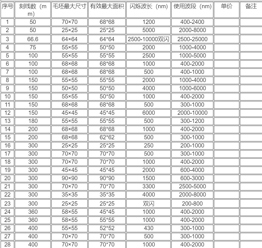 Transmission grating Spectral analysis Optical wavelength measurement Coaxial light Polarization insensitive Size can be customized