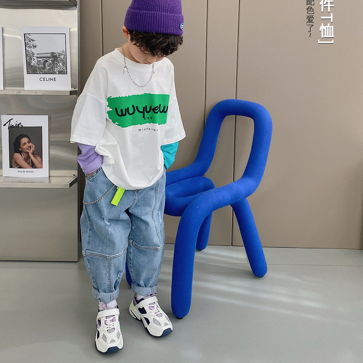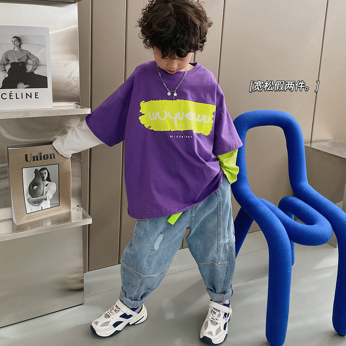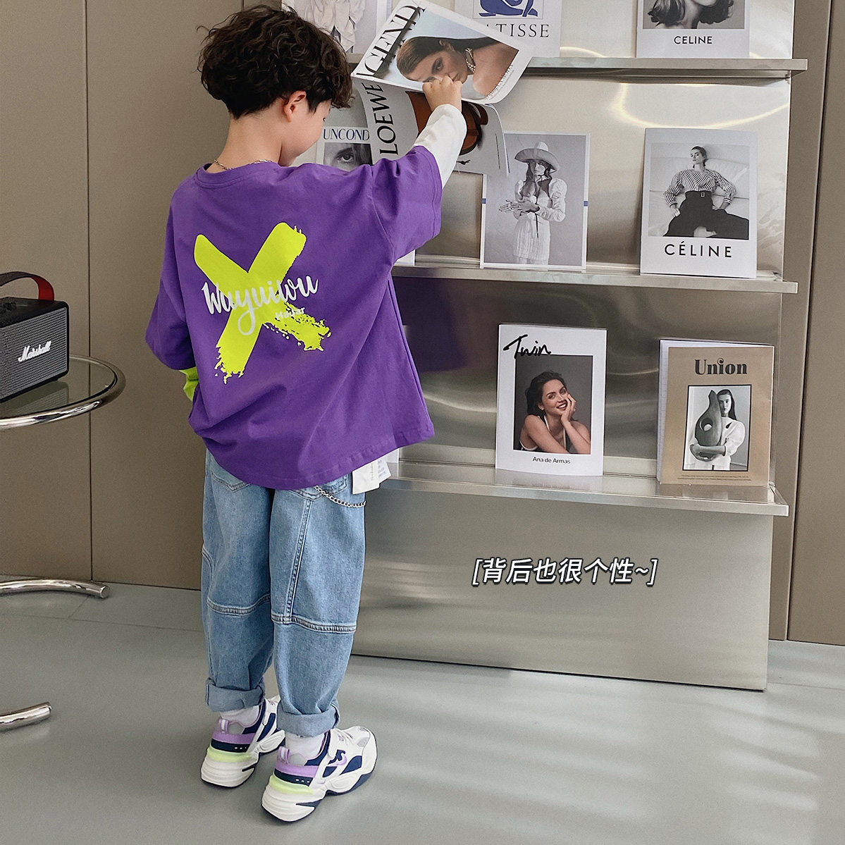 Boys' autumn fake two-piece cotton long-sleeved T-shirt children's clothing Korean version of the loose and handsome stitching top in the big boy trend