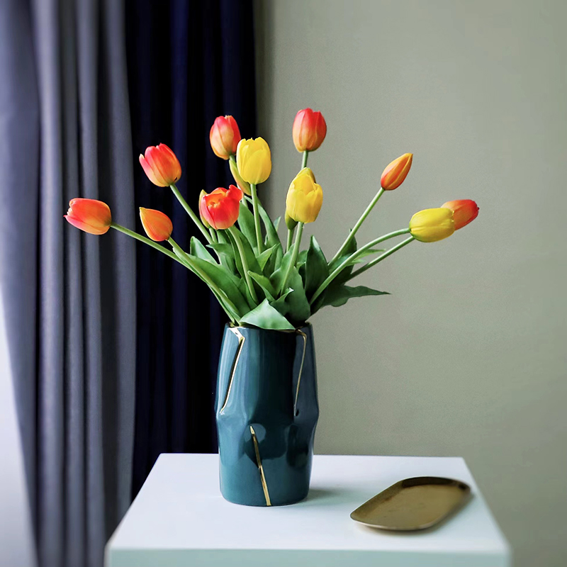 1 bunch white 1 bunch orange 1 bunch pink 1 bunch purple 1 bunch yellow 3 bunches white vase with gold mouth 3 bunches in yellow vase with golden mouth 3 bunches of orange tulips Conical gilded vase grey green