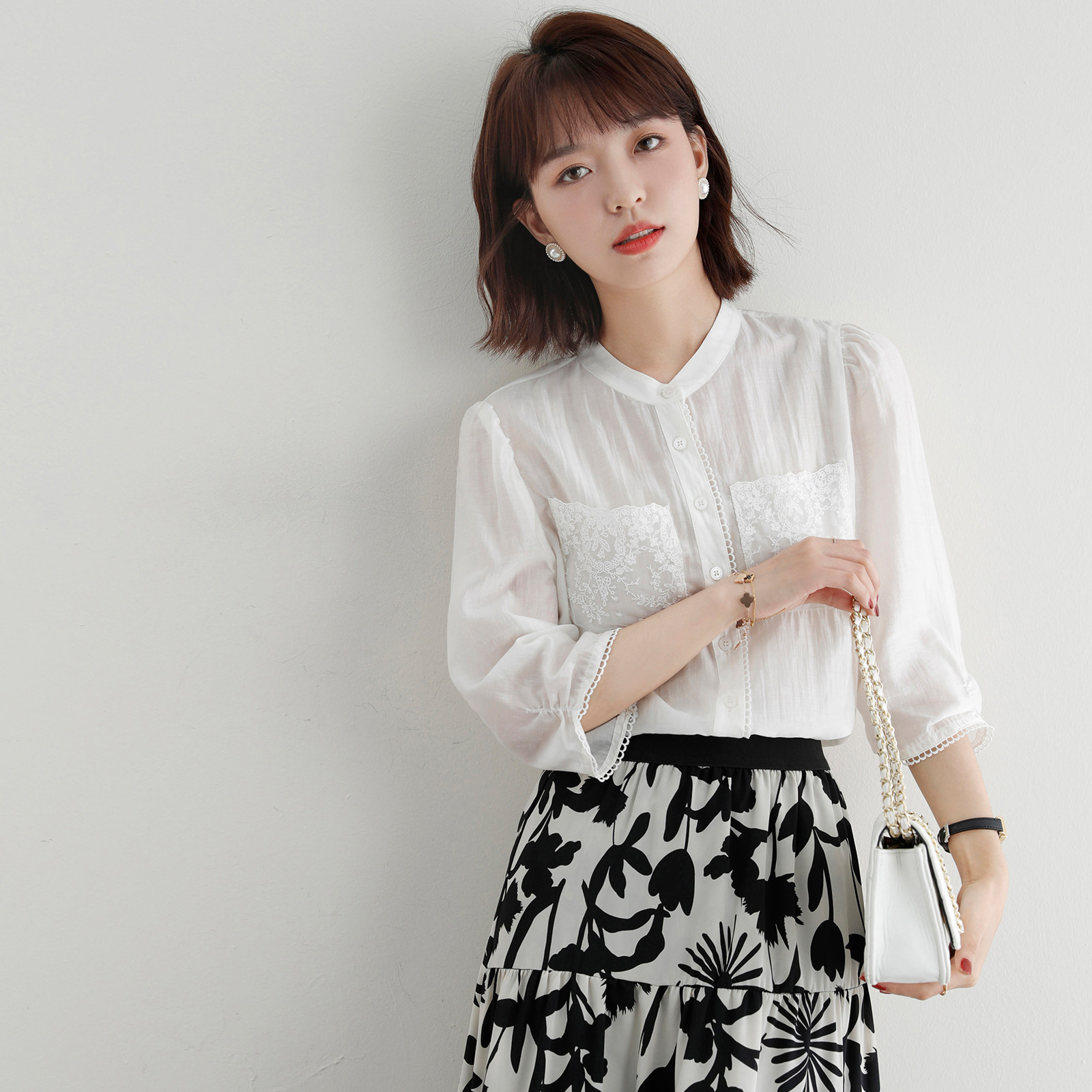 Loose with a good temperament to match ~ 2022 Summer elegance white French style 100 lap shirt woman
