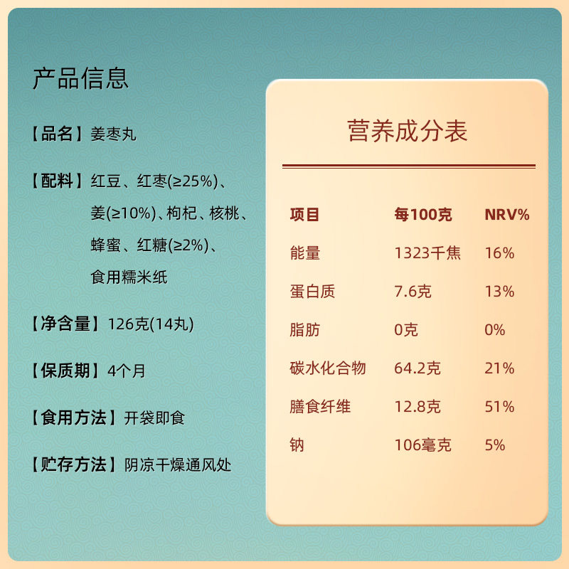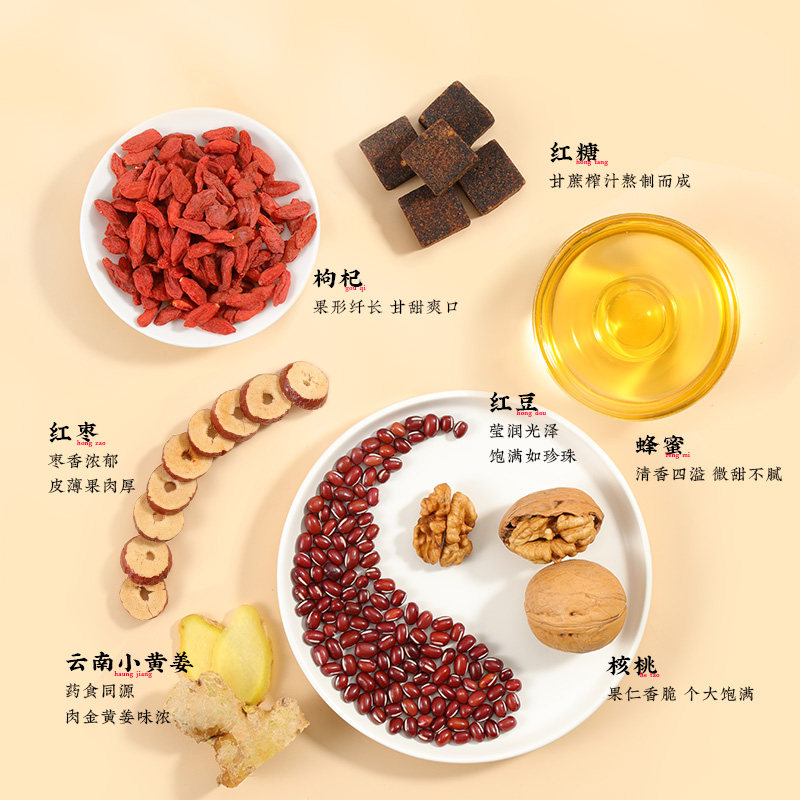Red bean red date (≥25 %) ginger (≥10 %) red berry walnut honey red sugar (≥2 %) consumed glutinous rice paper