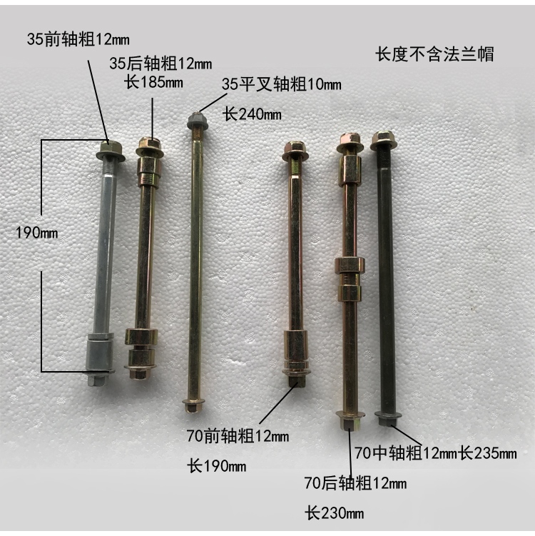 35 front axle 35 rear axle 70 front axle 70 rear axle 35 flat fork axle 10mm thick 70 flat fork axle 12mm thick 70 drum brake type flat fork with bushing 12mm self-locking nut flat fork bushing
