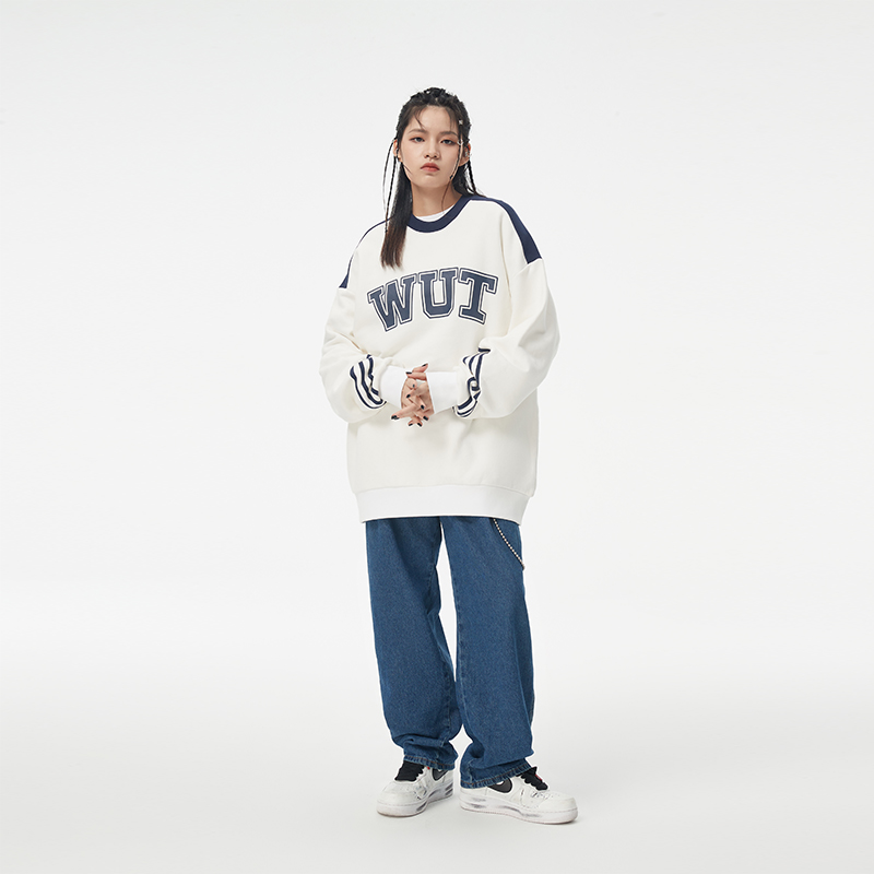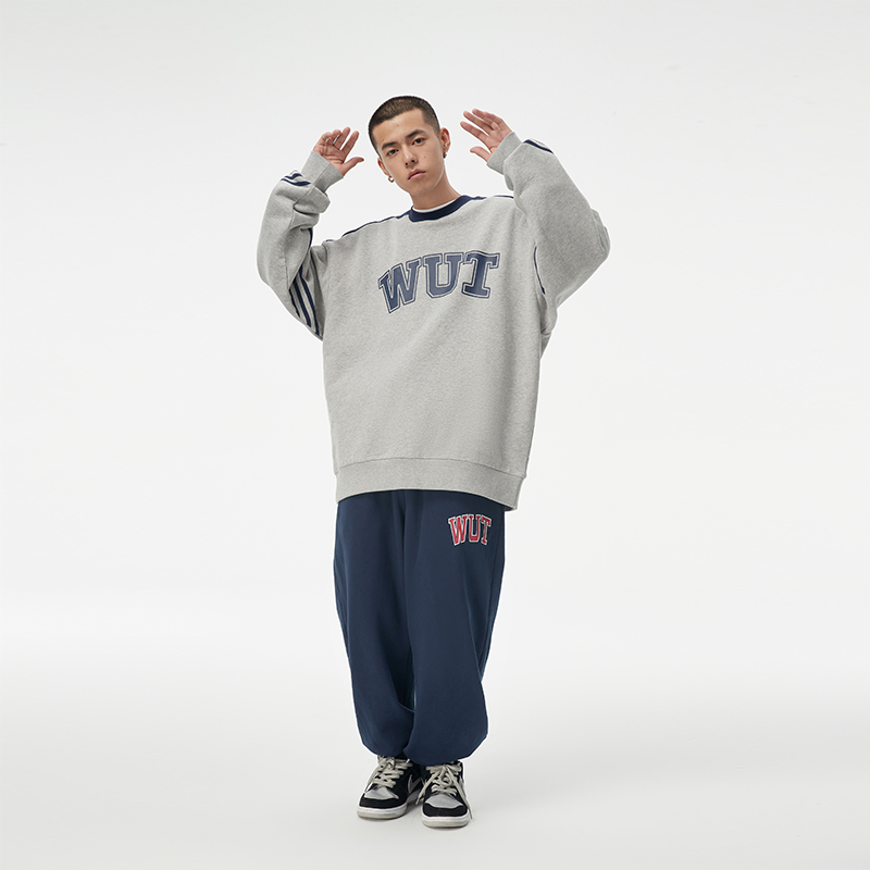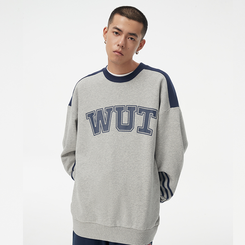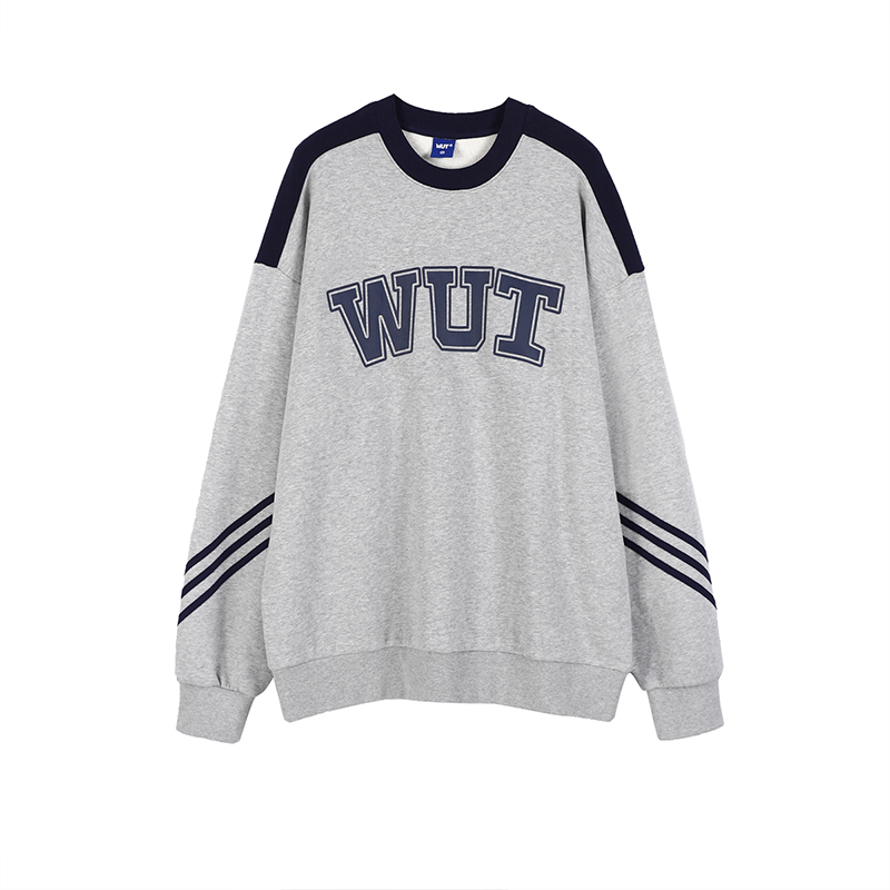 (WUT official store) Texture Aesthetics Series Three Bars Splicing Logo American Sweater 420g Plus Velvet New Frontier Cotton