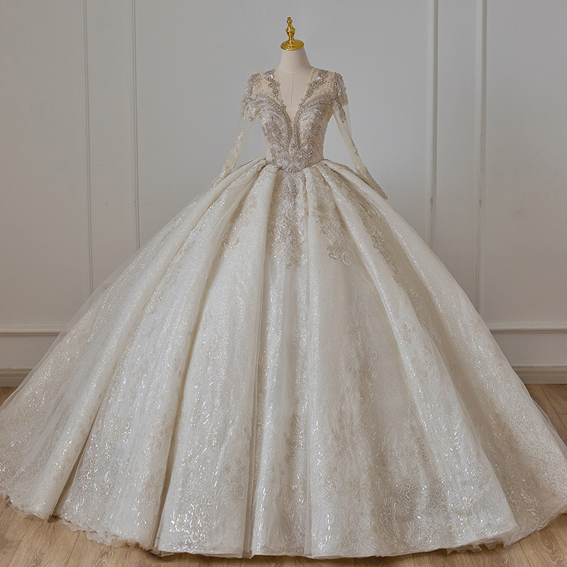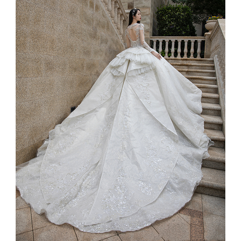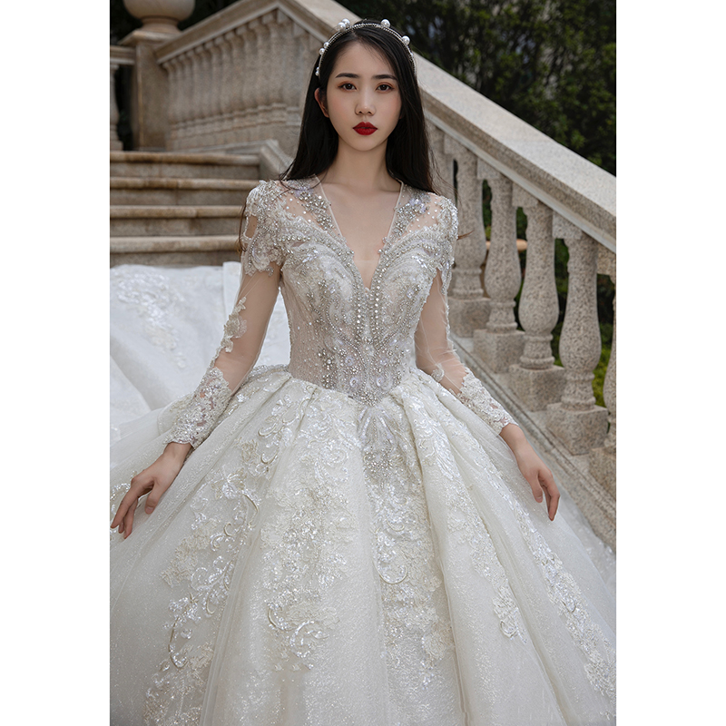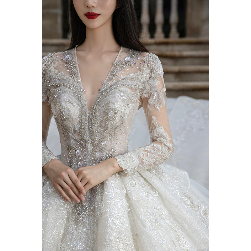 Long sleeve main wedding dress 2021 new bride temperament V collar advanced sense heavy industry Luxury Luxury big tailing court wind winter