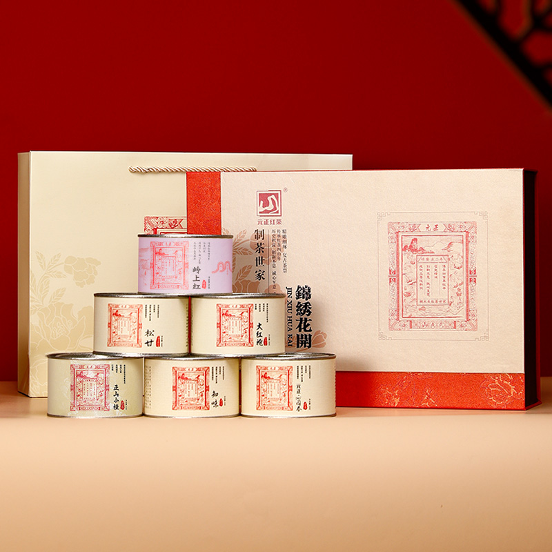 Yuan Zhengjin Embroidery Flower Opening Zhengshan Small Seed Gift Box Installed Wuyi Mountain Black Tea 6 Tea Combined Canned 300g