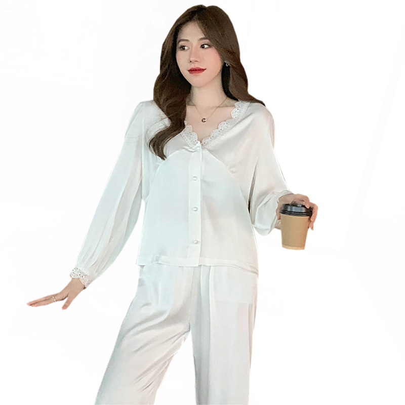 Women's pajamas spring and autumn ice silk long-sleeved suit sexy lace white silk net red home clothes thin section summer