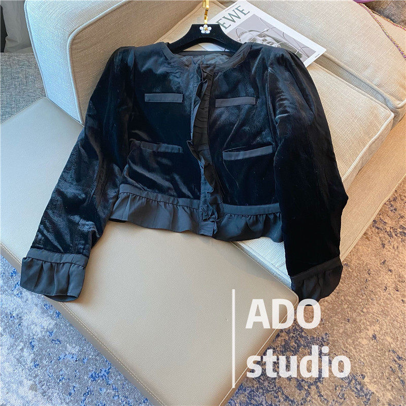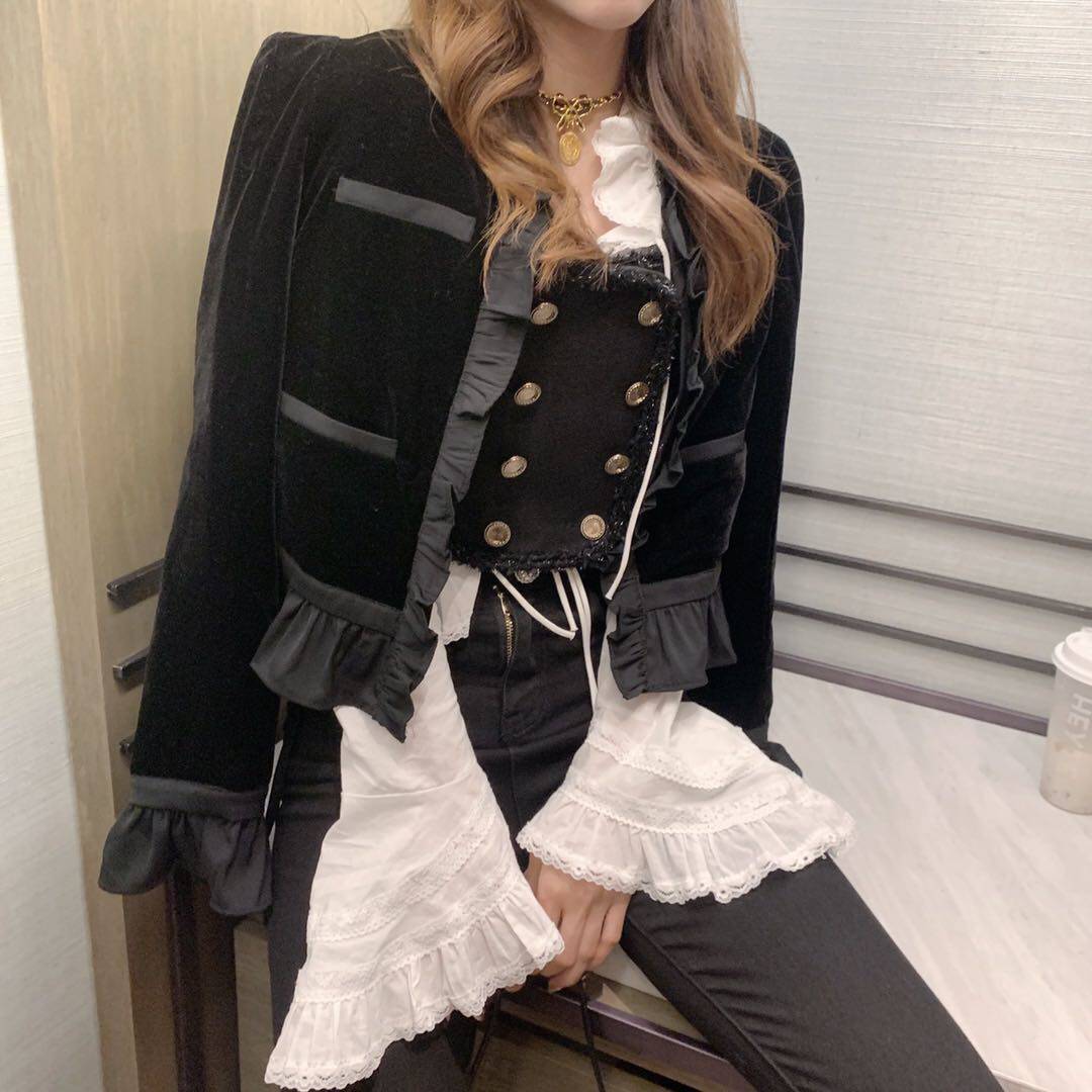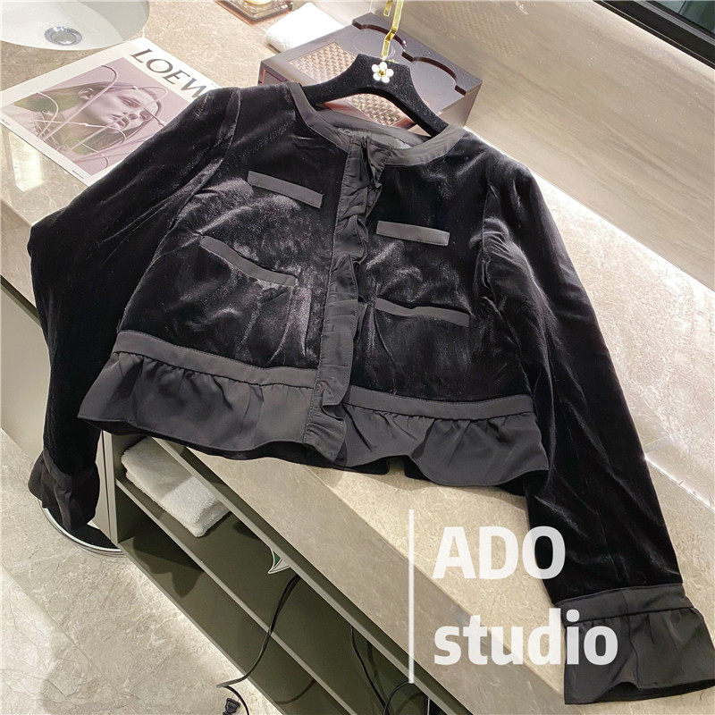 Small fragrant wind black down cotton clothes woman 2022 Spring and autumn style Elegant Lotus Leaf Lace Velvet Short thin cotton jacket