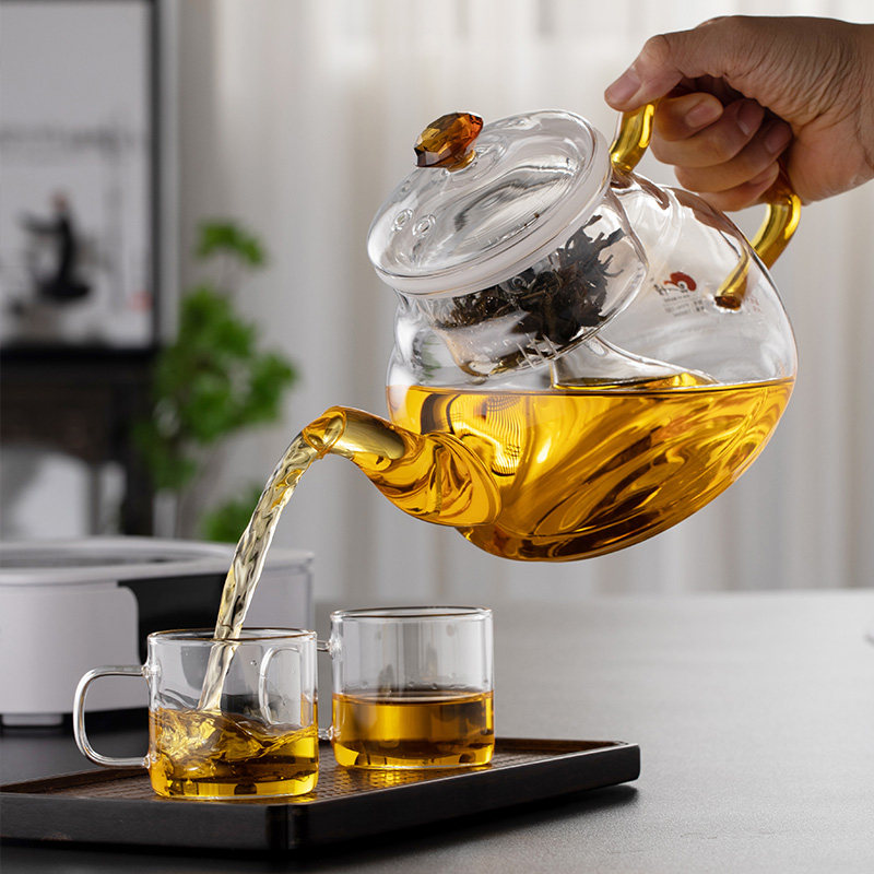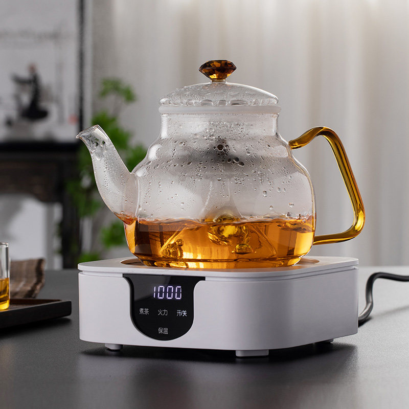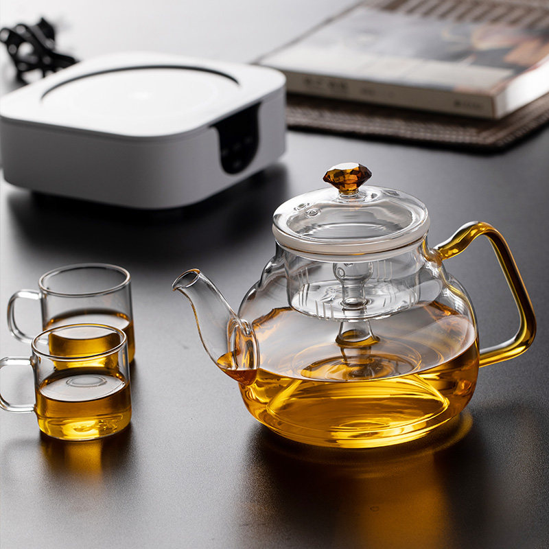 Yellow teapot Wood circle furnace 4 teacups Transparent teapot Wood circle stove 4 cups Yellow cooking teapot Little white cup 4 cups Transparent cooking teapot