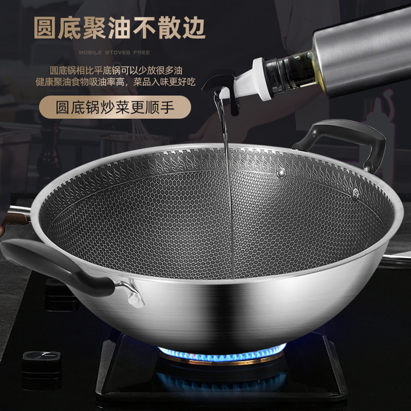 Double ear frying pan 304 stainless steel non-stick pot household large round bottom frying pan gas concave induction cooker special
