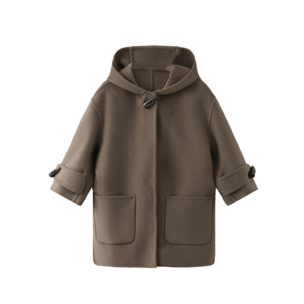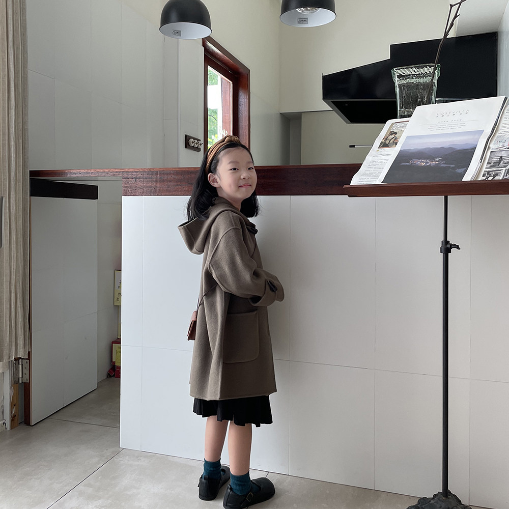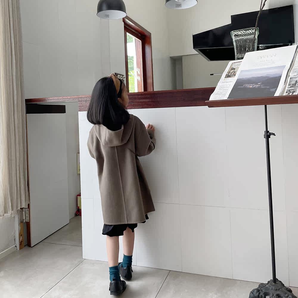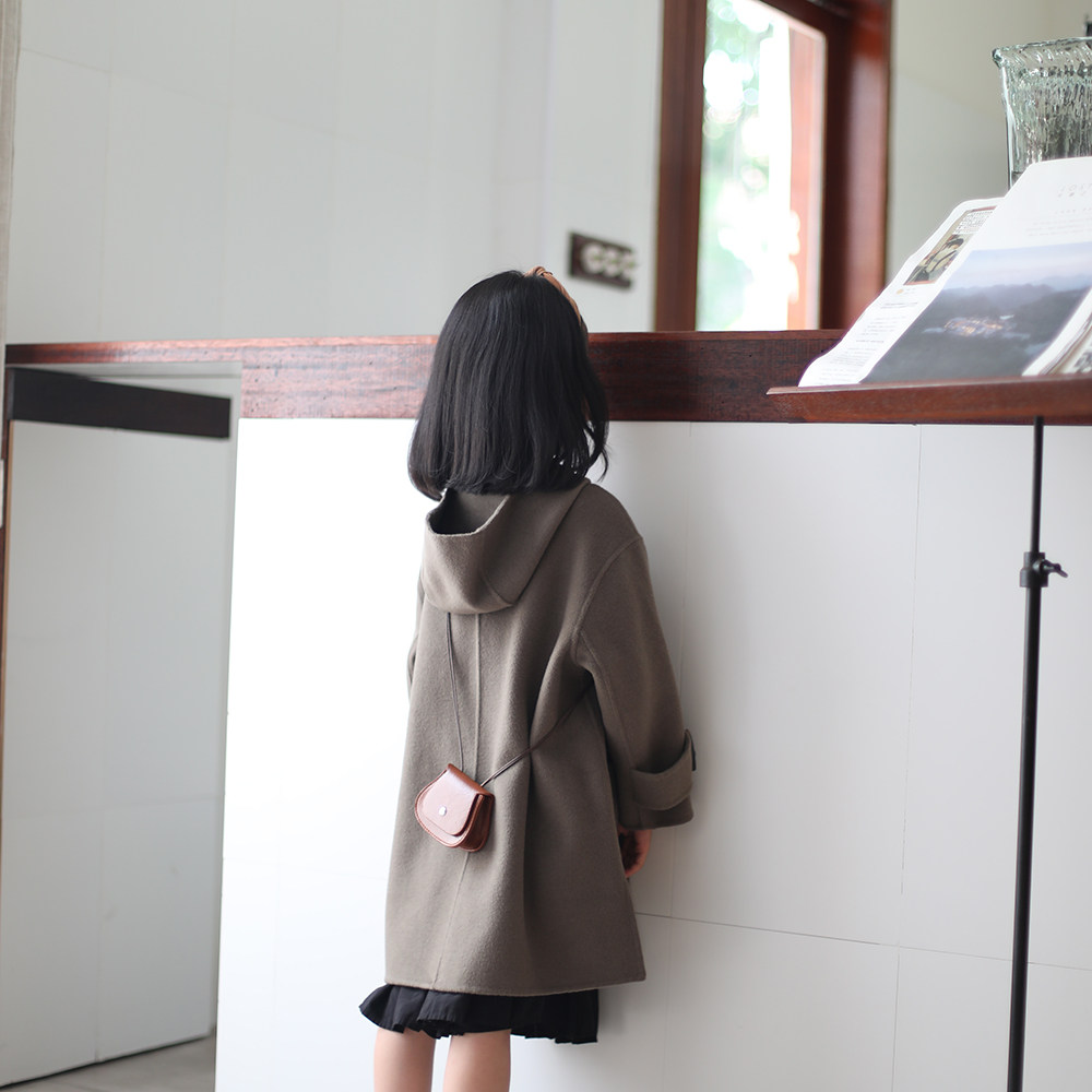 Girl's horn buckle double face suede wool coat 2021 autumn and winter foreign Korean version with hat cloak cloak child's jacket