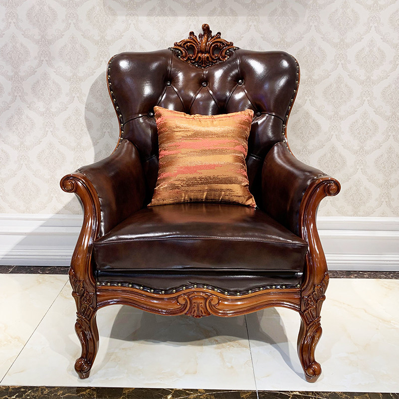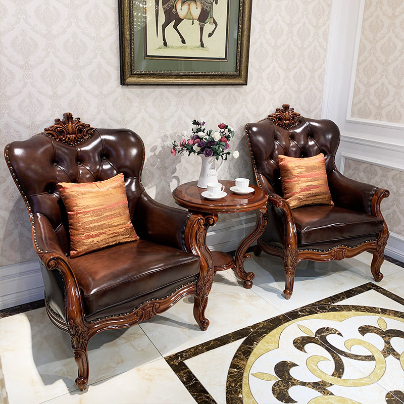 European-style leather solid wood leisure chair home single carved sofa chair soft bag armchair table and chair combination book chair