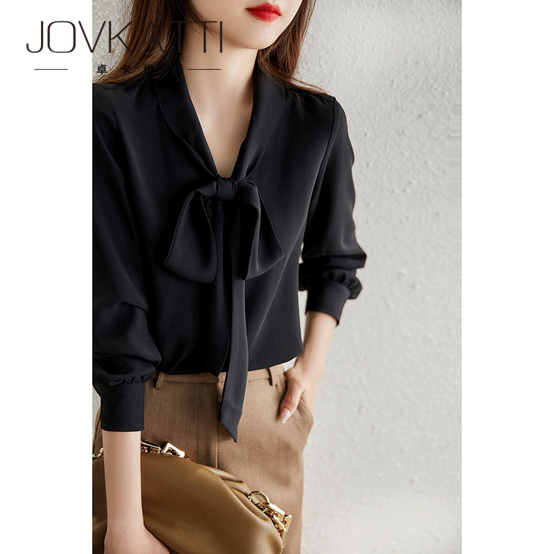 JOVKATTI Intellectual Elegance Daily Versatile Temperament Tops Workplace Commuter Style Long-sleeved Bow Knot Lace-Up Shirt
