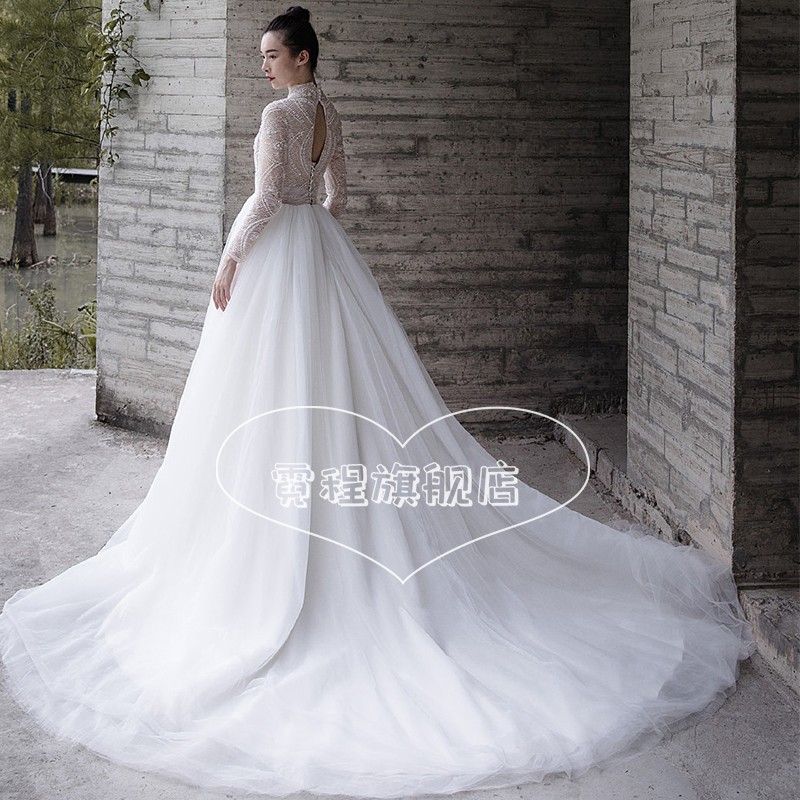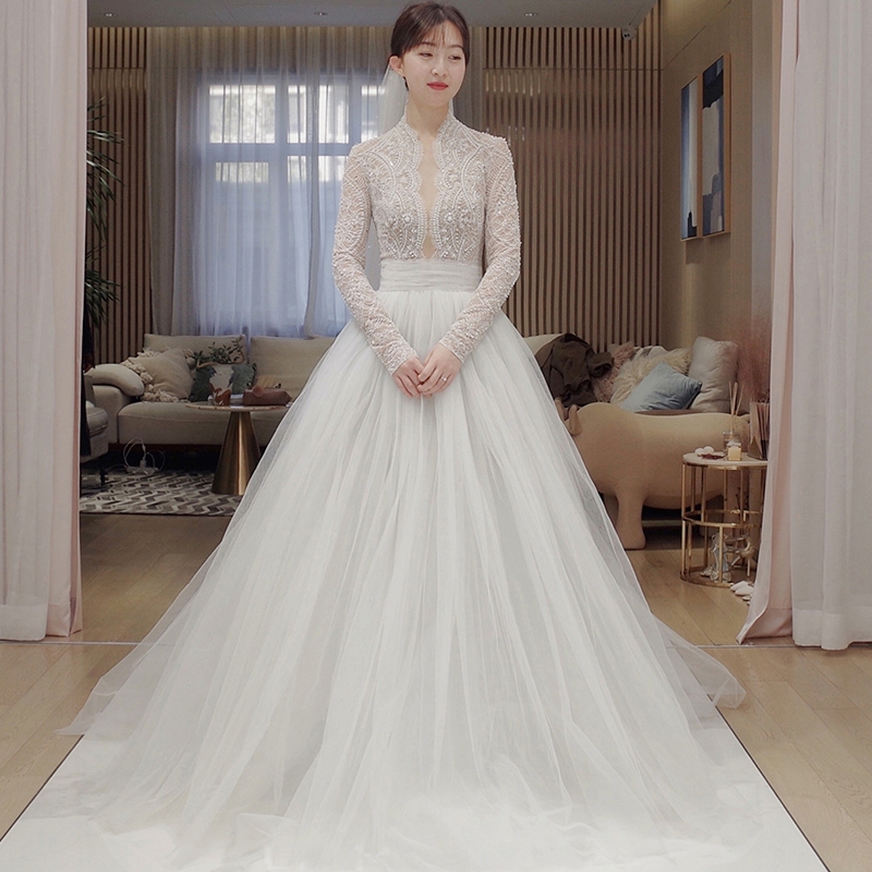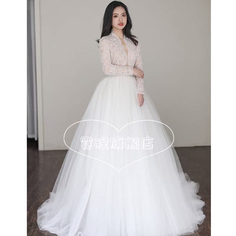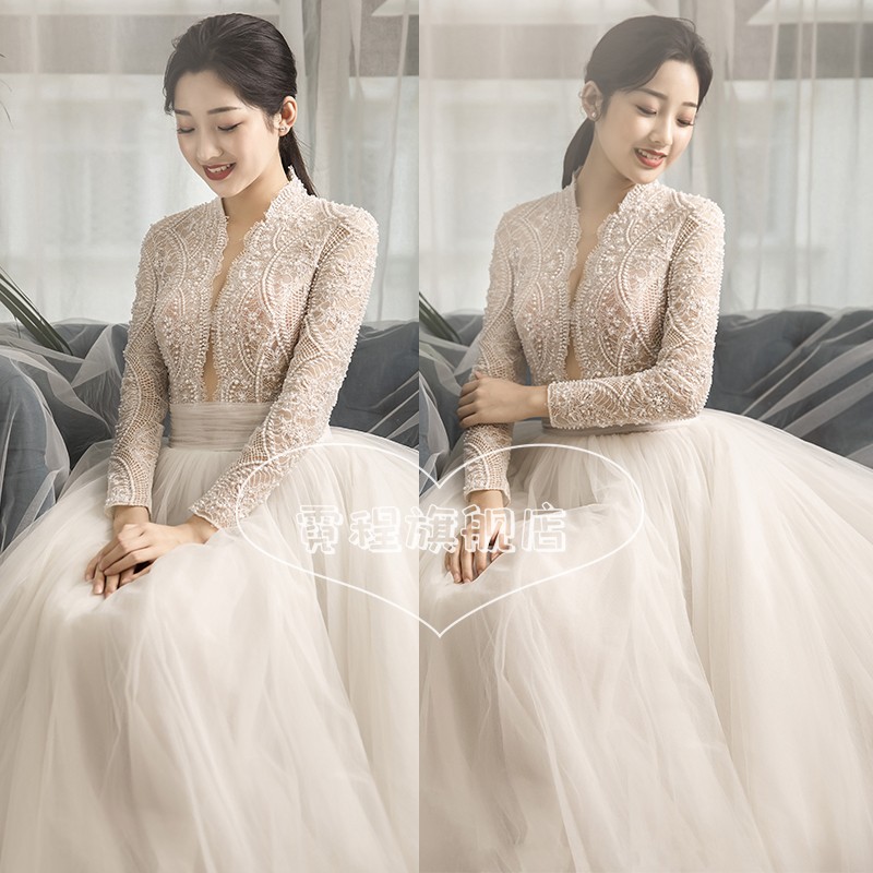 Long sleeve main wedding dress bridal 2022 new trailing small children out of the door yarn light French style retro v collar women's autumn winter-Taobao