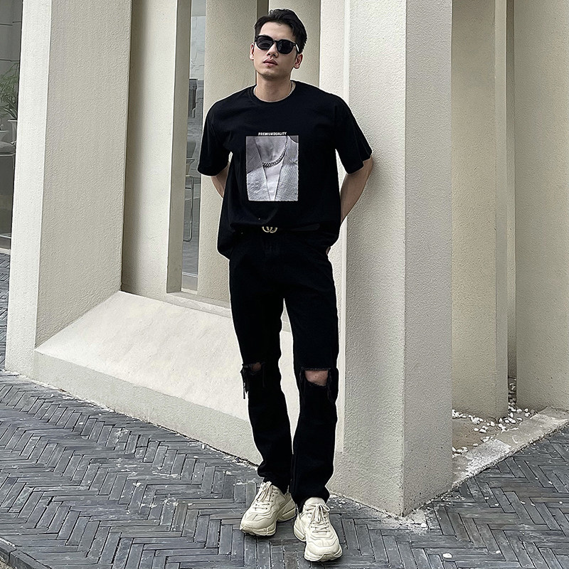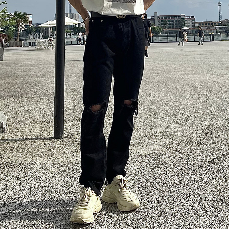 Broken Hole Jeans Men's Boomer Summer Sashimi Sports Casual Retro High Street Trends Small Feet Black Fitness Trousers