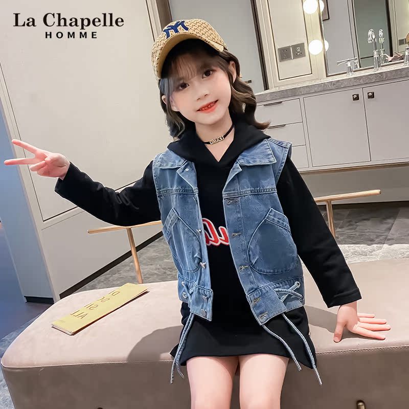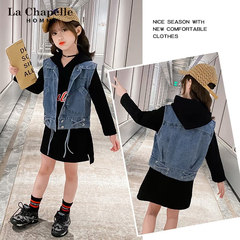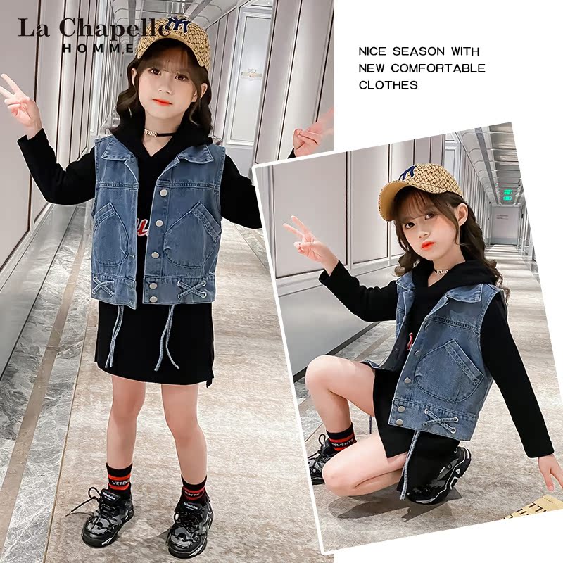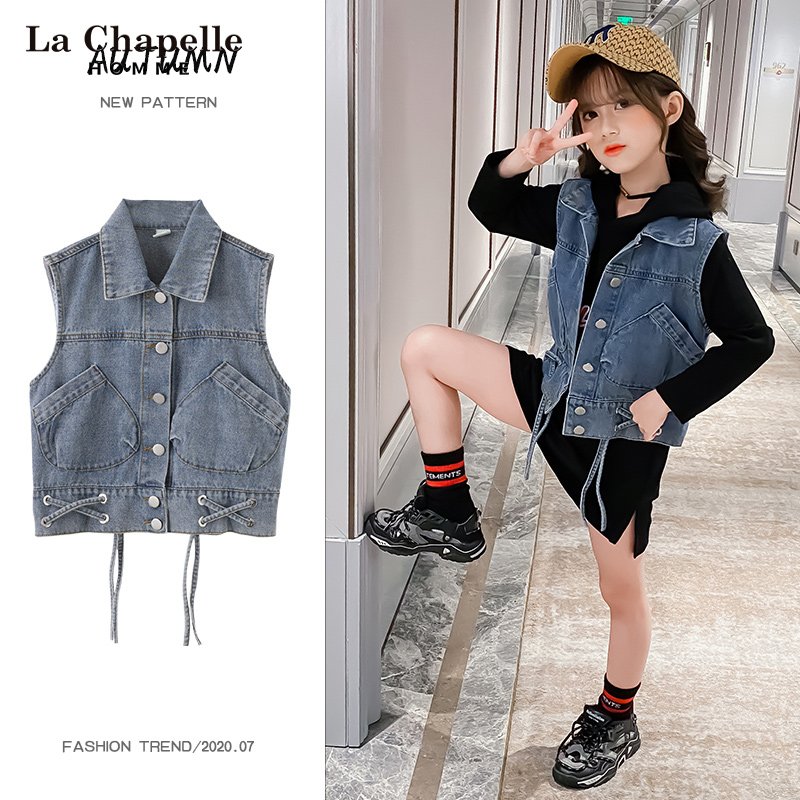 La Chapelle Girls Cowboy Vest Spring and Autumn Thin Big Boy Blue Sleeveless Vest Wearing Children's Cardigan Jacket