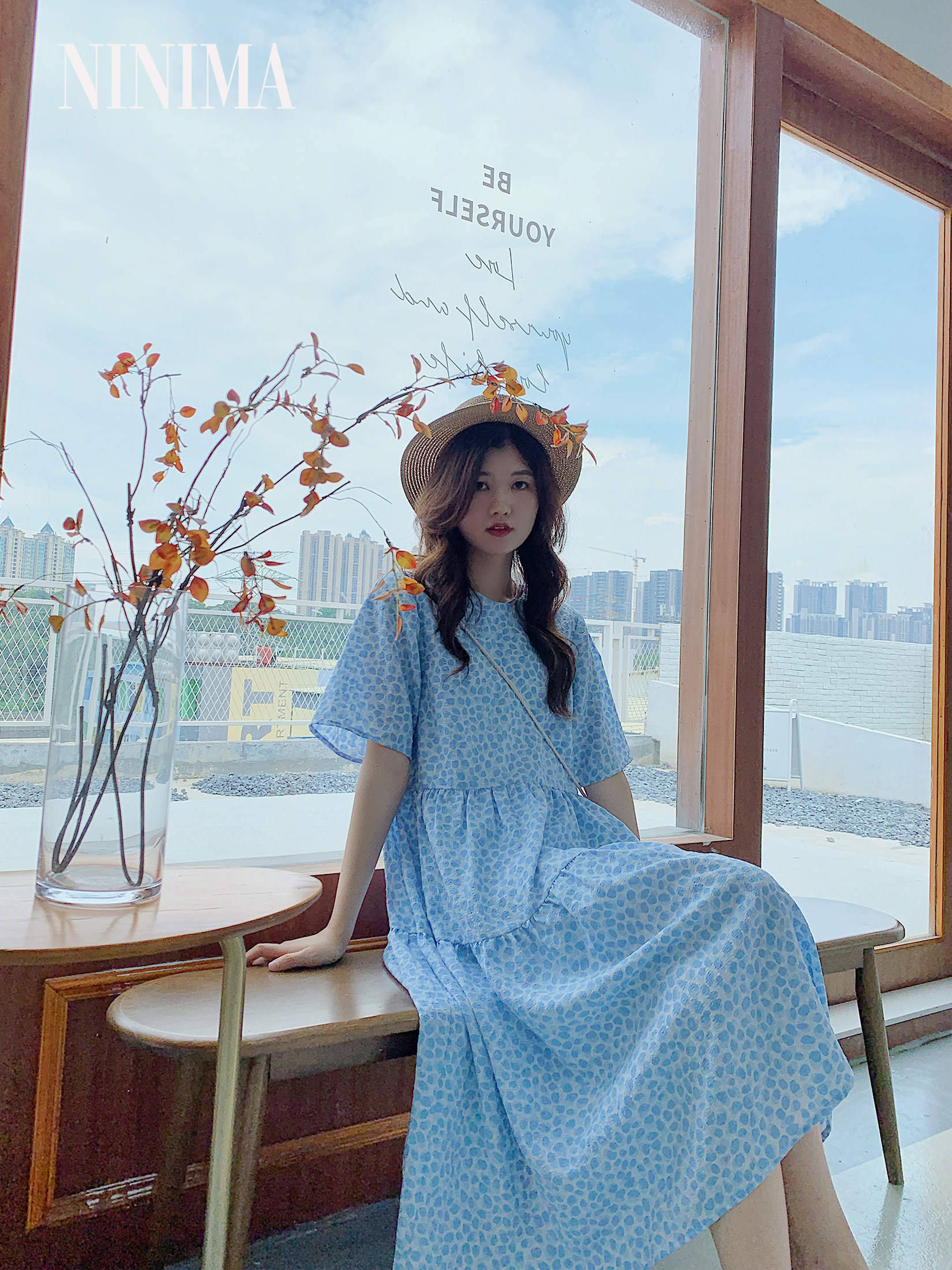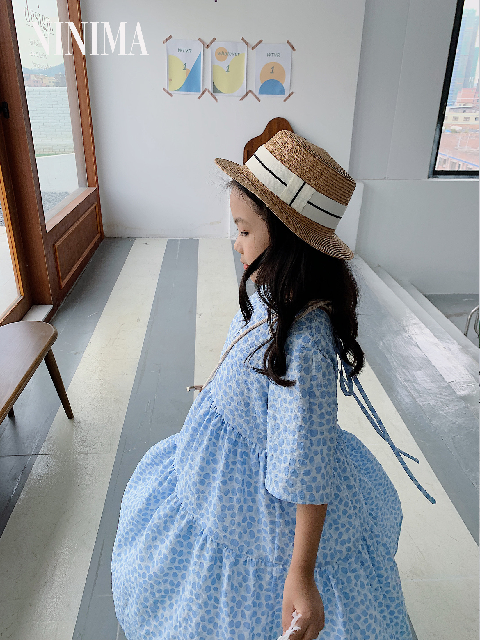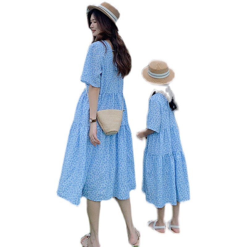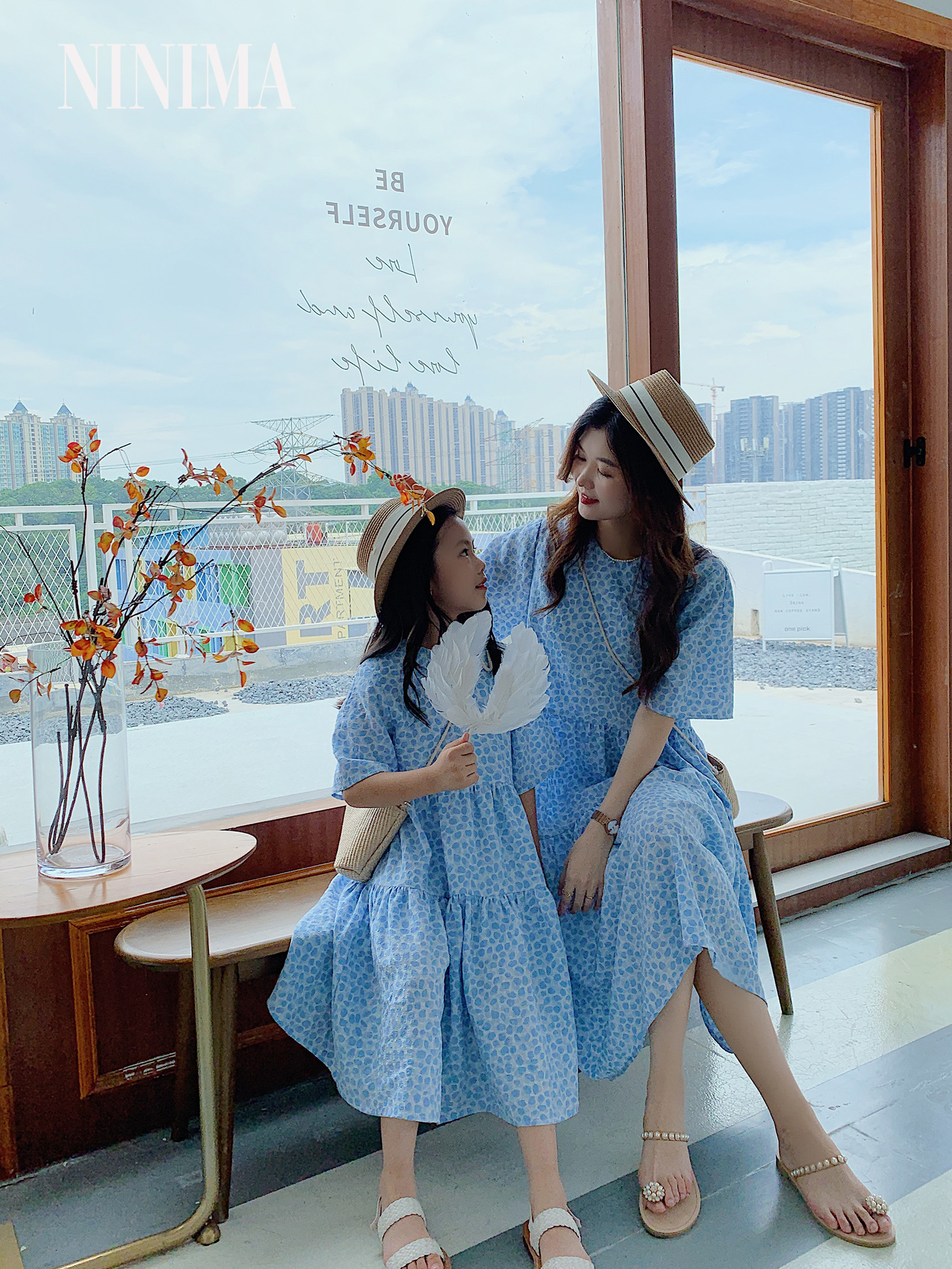 Nicanima Pale Blue First Love Wave Dot Bubble short sleeves Dress Strap Sweet beach mid-length Skirt Parenting-Taobao