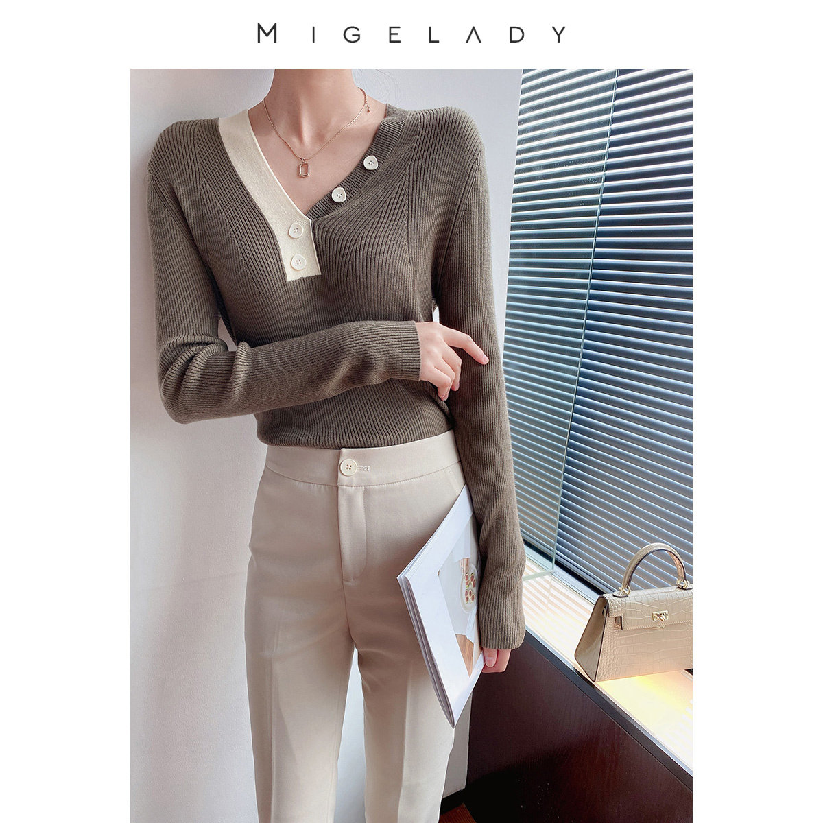 Advanced senses green sweater temperament V collar Coloured long sleeves knit blouse Don't make a design sense Korean teas gentle autumn and winter