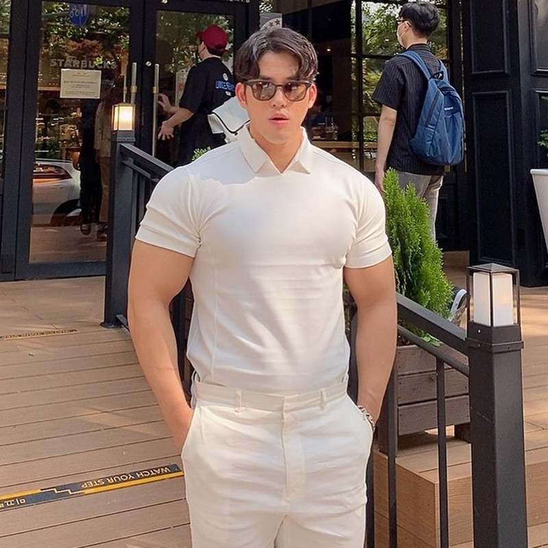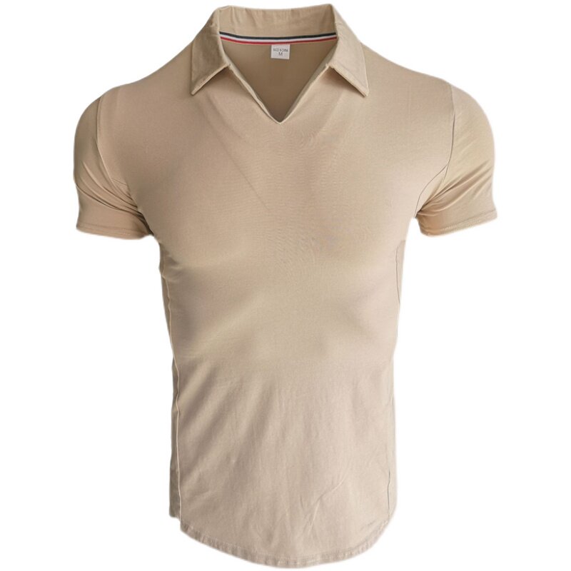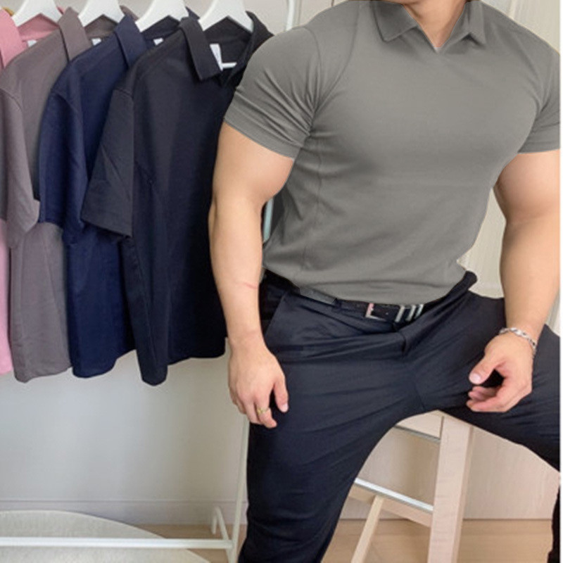 Summer V-Neck Muscle Sports Tights Polo Shirt Lapel Solid Color Round Hem Cotton Stretch Slim Fit Gym Short Sleeves