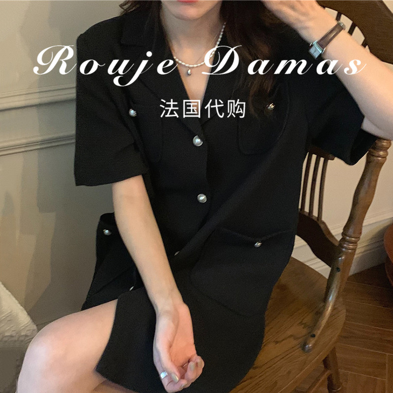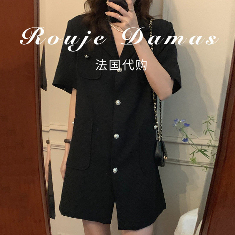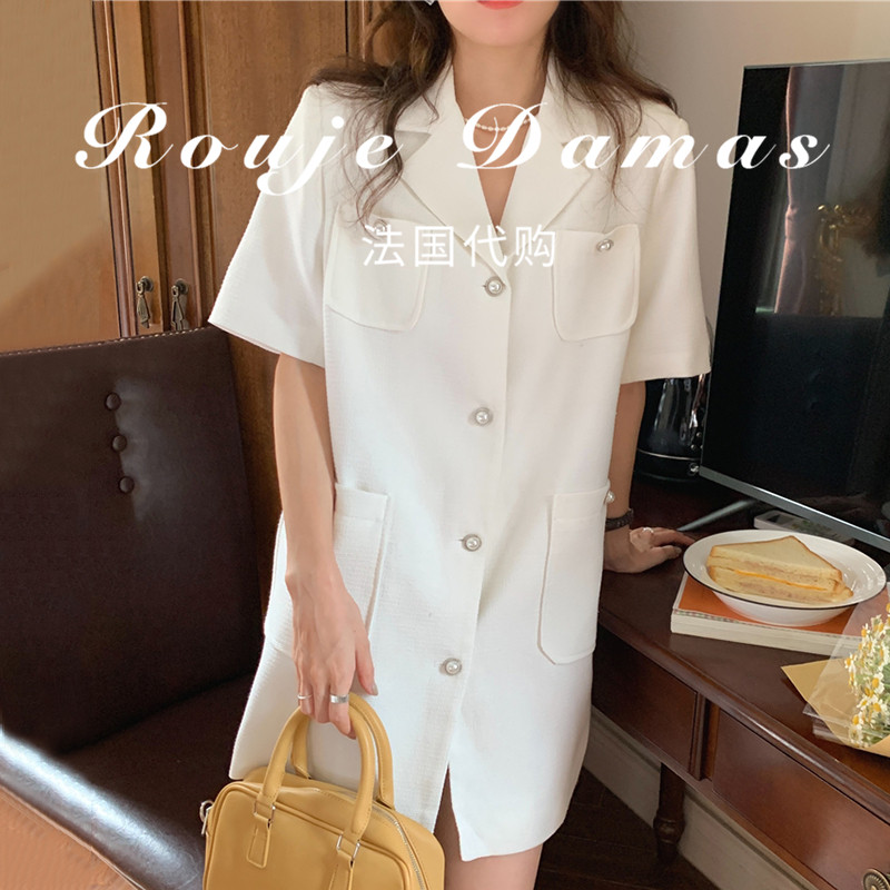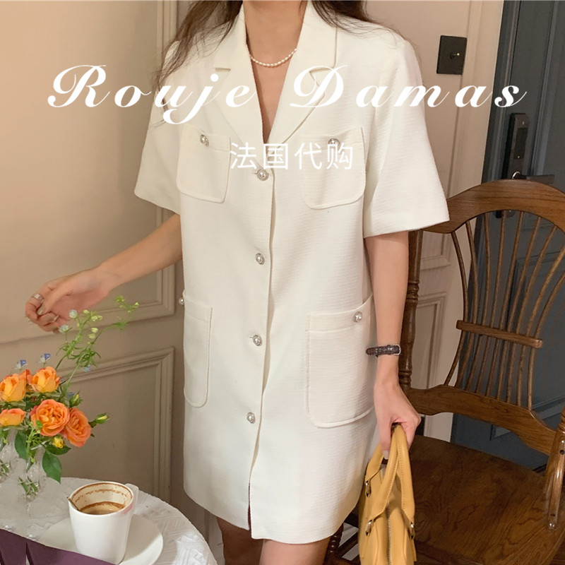 French Rouje Damas summer suit collar multi-pocket design single row pearl buckle loose short sleeves dress women