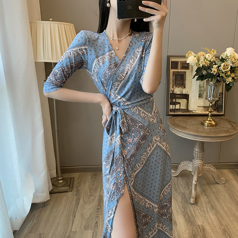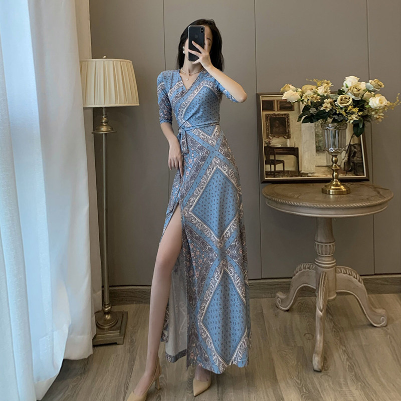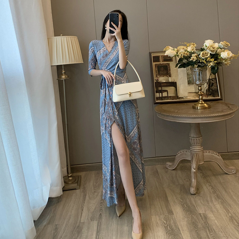 2023 Spring Summer new collection waist Skinder with slim open fork V collar Broken Flowers Wrap dress Skirt Temperament Long Dress Holiday Tandem Dress