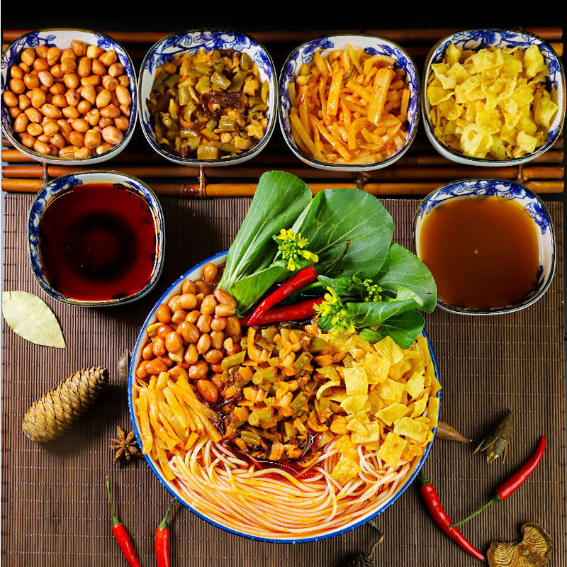 Dried rice noodles package soup ingredients package chili oil package beans carrot fungus package bean curd peanuts package sour bamboo shoots package sour vinegar package